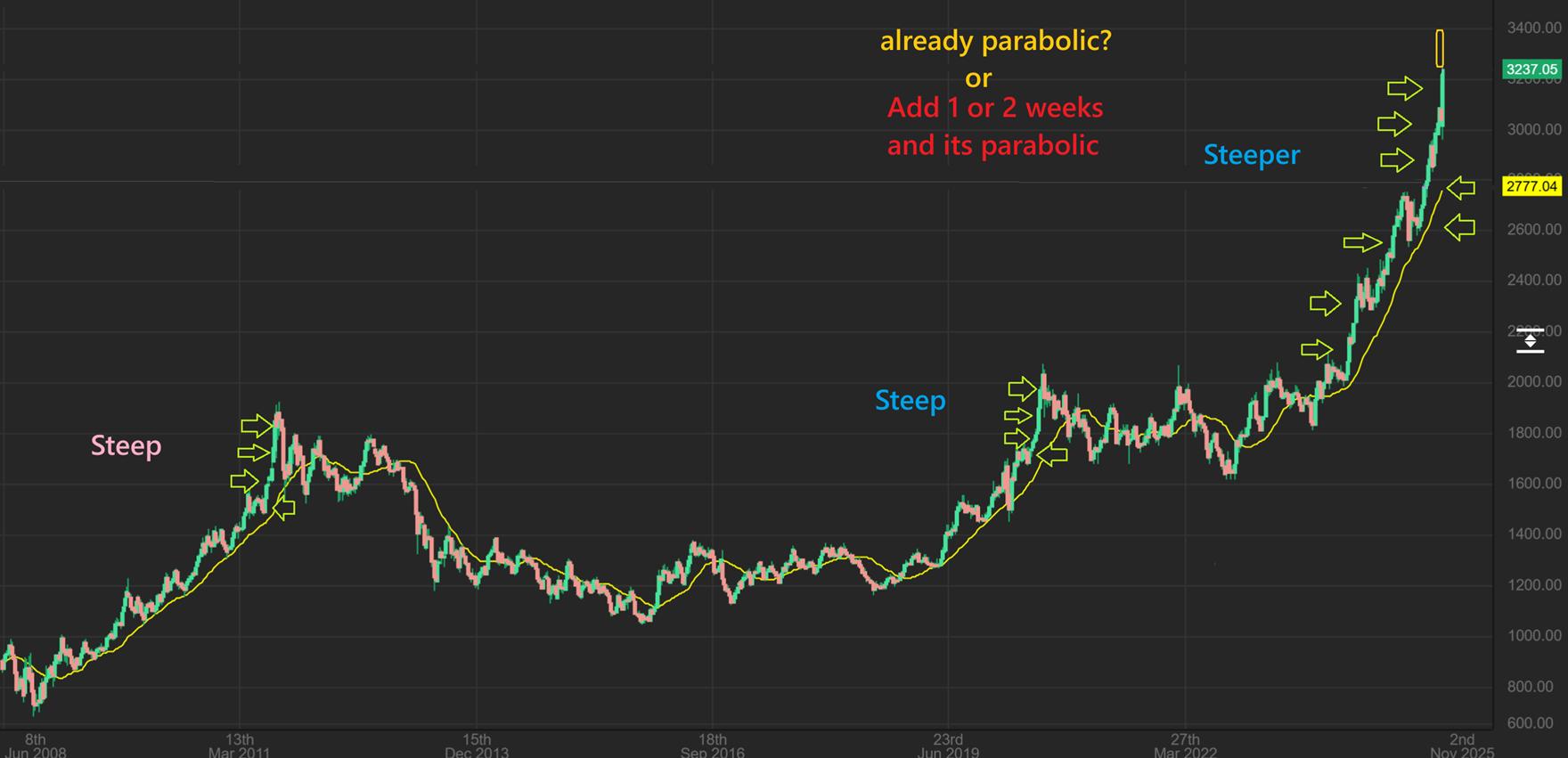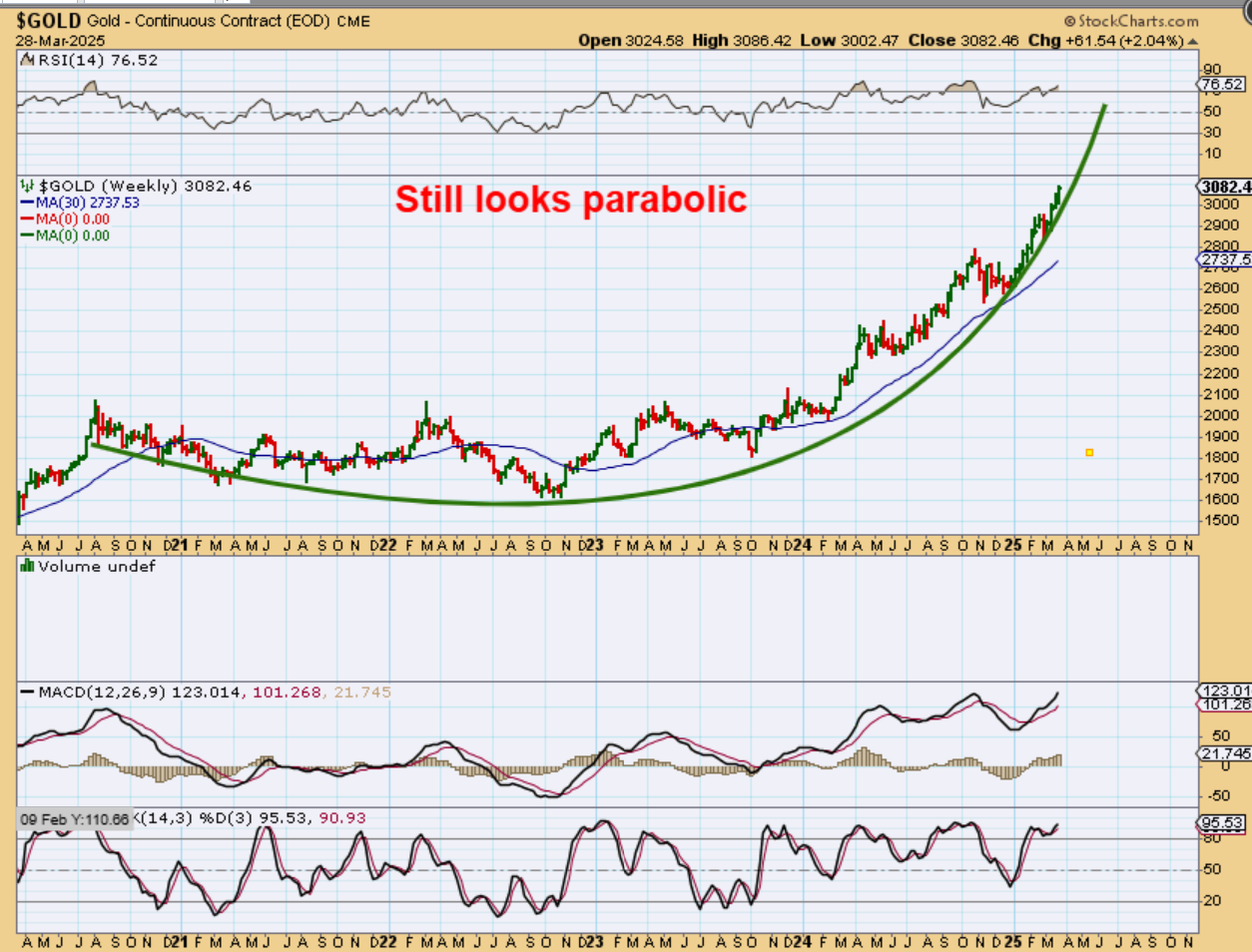 The steep incline continued after a 1 week pause, so this was my March 28th weekly chart to show how parabolic run could still be taking place.