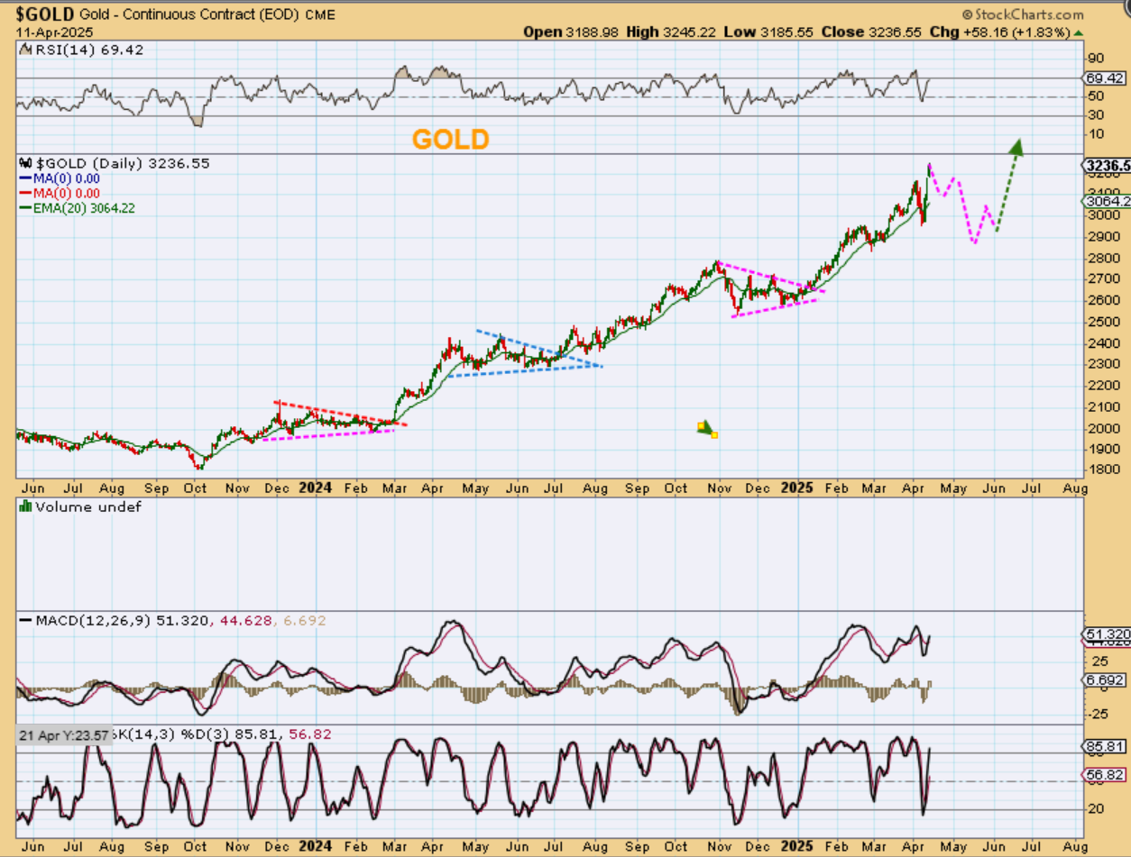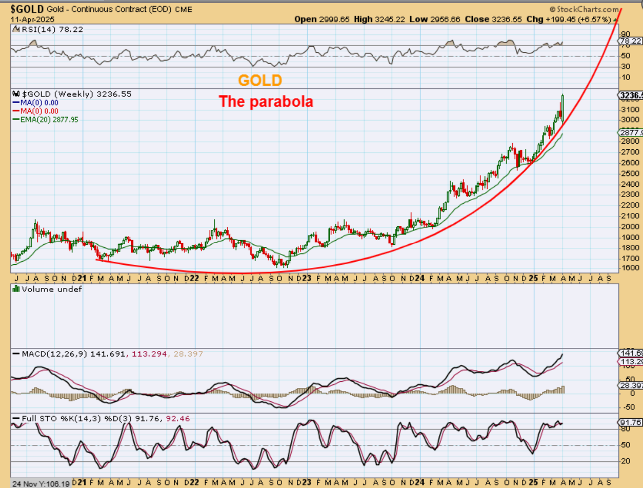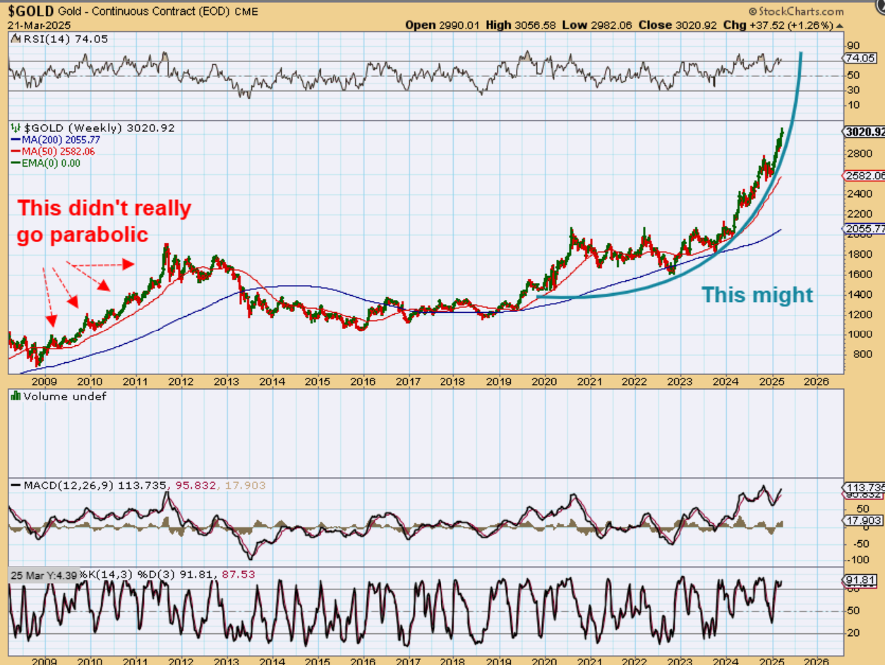 Take a look at my next charts. I have been saying for a while that Gold could go parabolic. This was my March 21st chart to show how that could take place.