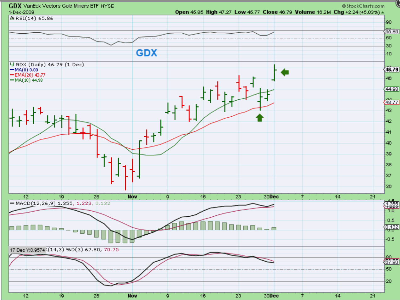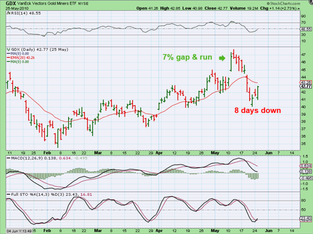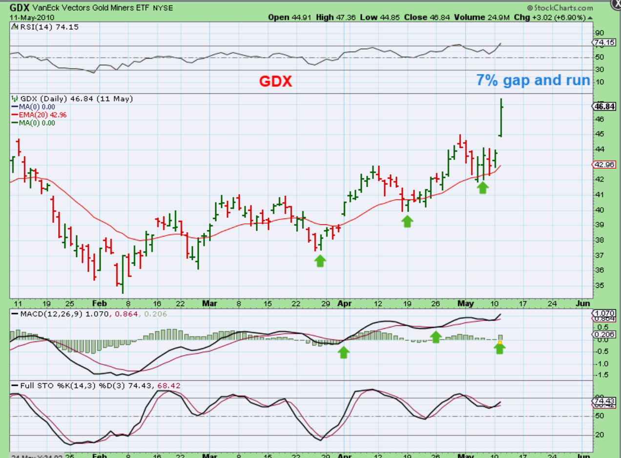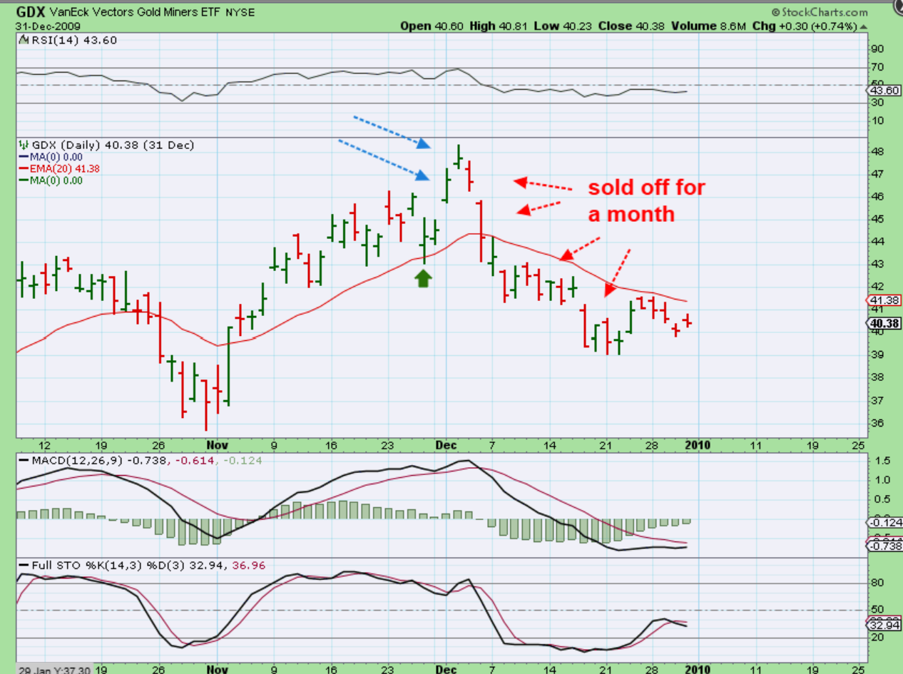 Let’s take a look at a past surge higher with The GDX in Dec 2009, when Gold was in a bull run. Did it just keep on ripping higher, or can a strong gap up to new highs like we see here weaken and dip into a dcl?