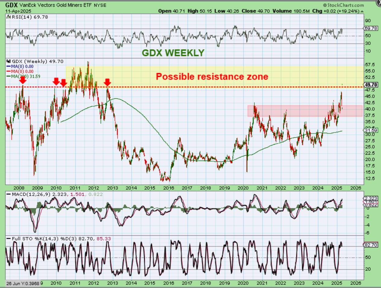 GDX has made it through that resistance area that I pointed out in the past, and there is another one overhead, so I would say that the GDX can move higher next week too.