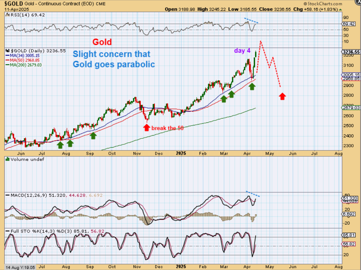CONCLUSION: I’d rather see GOLD do this and THEN a final ramp up to a parabolic blow off top, but we’ll have to see what it does for the next week or 2, since we are only on day 5 Monday.