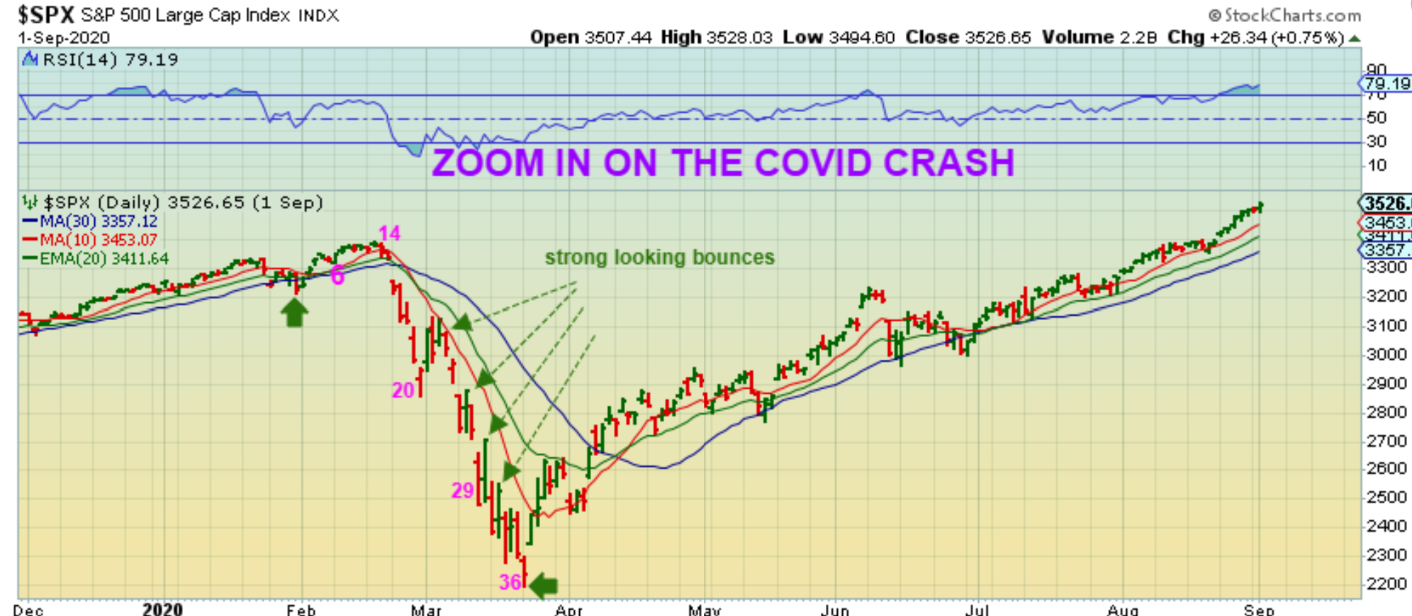 SPX – So now I’m pointing out a reversal at day 20 during the covid crash that bounced, dropped, bounced, dropped, bounced, etc. This is why we would use a stop if we go long and raise it as price runs higher. Noteworthy is the fact that price couldn’t bounce above the red 10 sma. The current bounce is at the 10sma now.