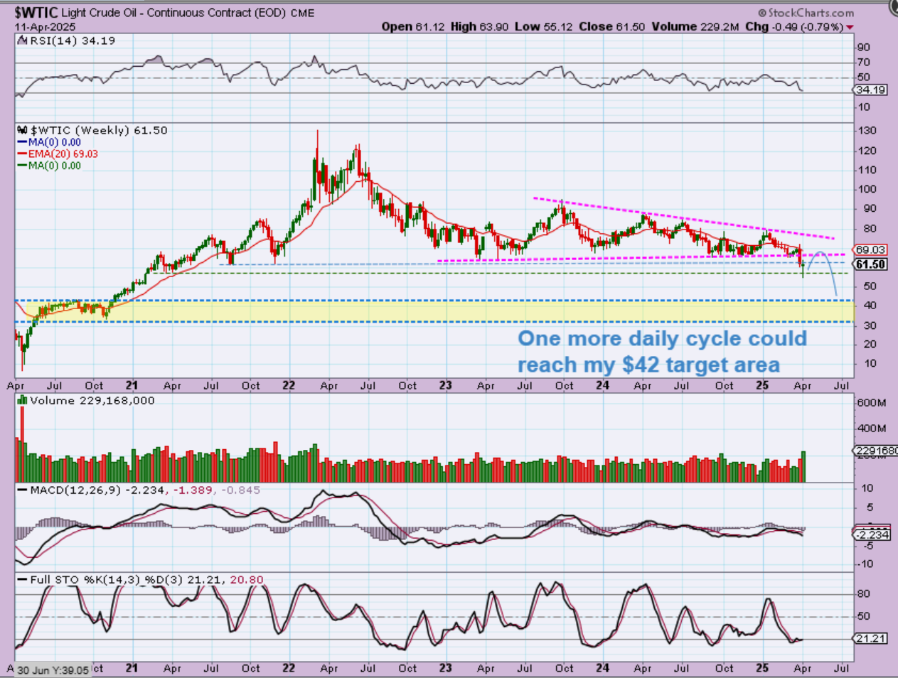 WTIC – Timewise we could have another daily cycle and that would give us a bounce, a back-test, and another drop that could look like this.