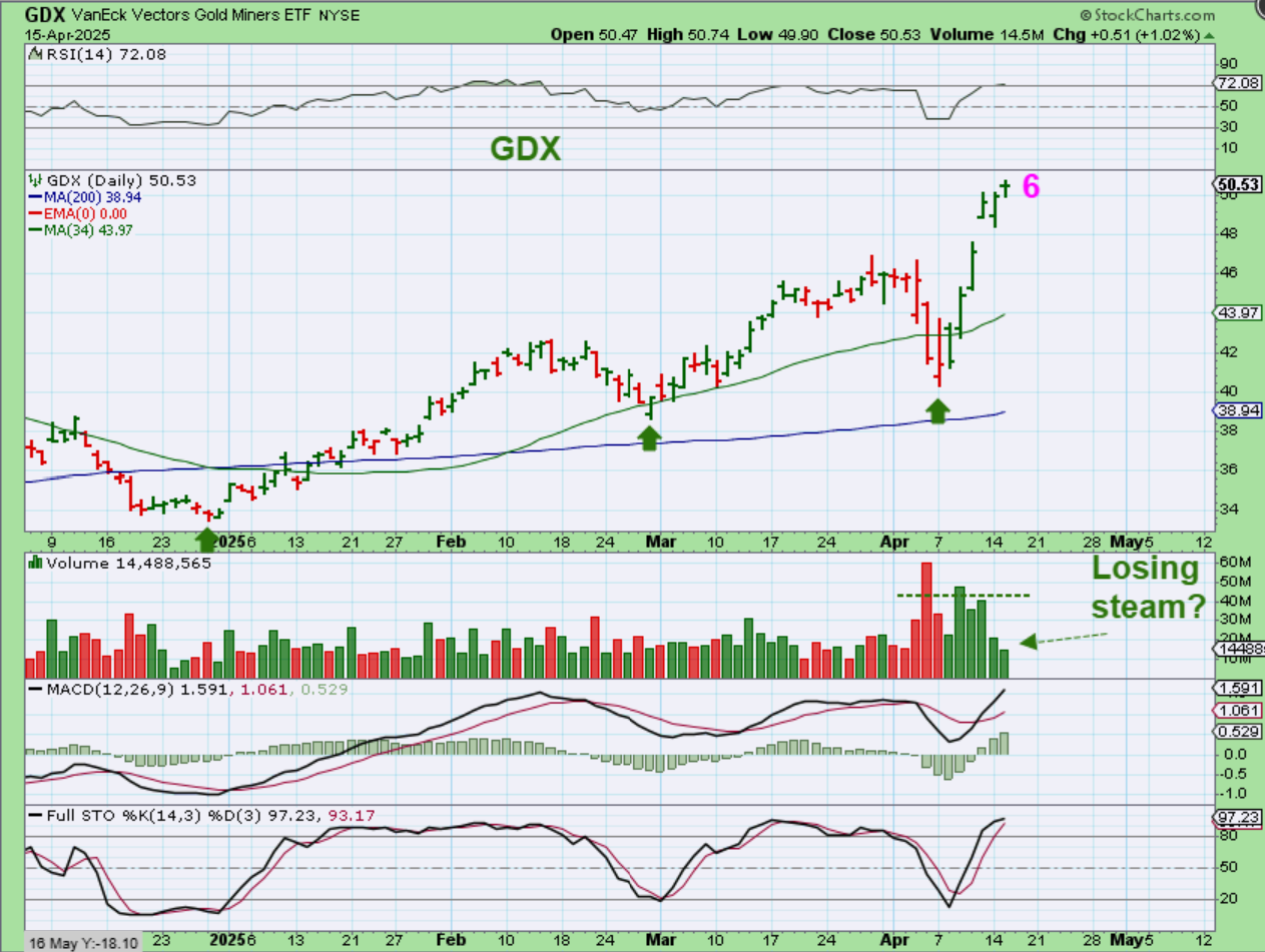 As mentioned yesterday, The GDX ETF is acting more like Gold than Silver. When we got our dcl, I mentioned buying and raising stops in case it becomes L.T., but so far it is running nicely. A stop at the gap would work to lock in gains now. I’ll be watching the volume today, but with Gold up $80, the volume may come in.