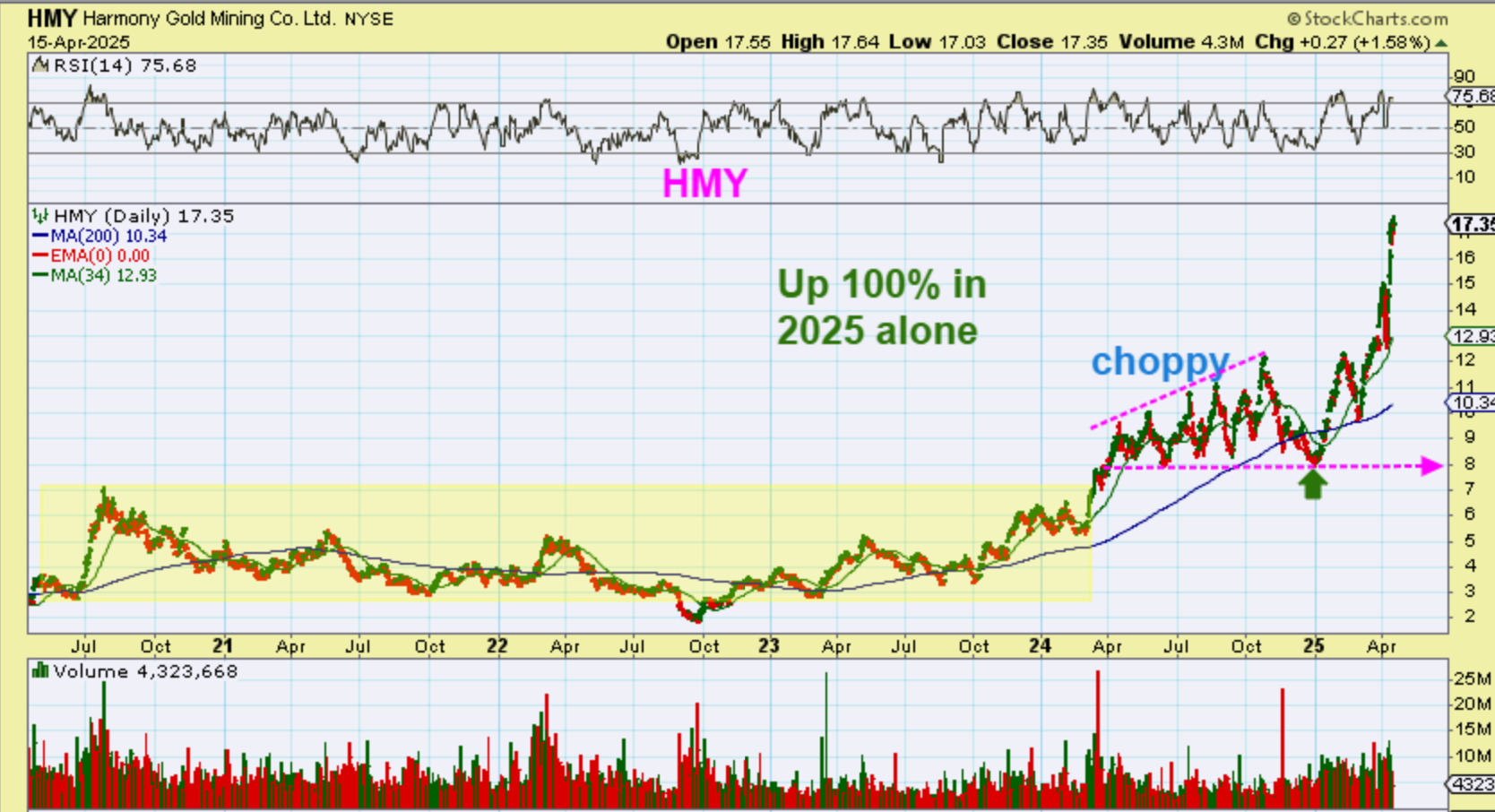 I do want to point out 2024 though. I started to HATE HMY, because every time it broke out to new highs it quickly crashed to the lows again. It dropped form $10 to $8, $11 to $8, and $12 to $8! I did not continue to carry my heavy position from the lows, because it just didn’t look like it could hold the gains. It dropped from $12 to $8 in the last ICL, and then ran from $8 to $17.55 so far. This is also now starting to look parabolic. 🙁