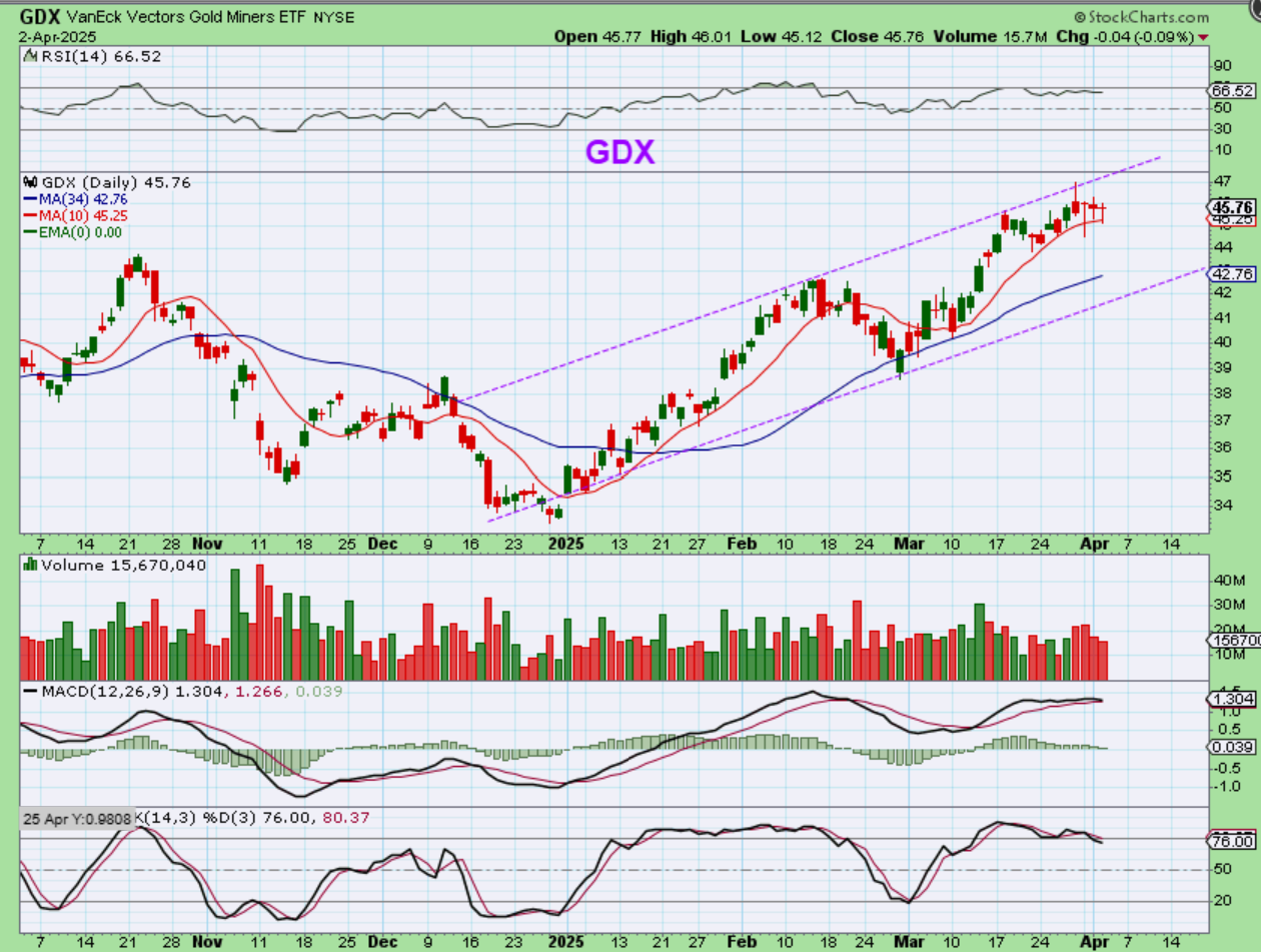 GDX is hugging the highs, but we do want to recognize that it is getting somewhat late in daily cycle too. Can this go higher? It could if the markets tank and gold Pops, but we are on day 23, so it also could start to pullback from the upper trend line.