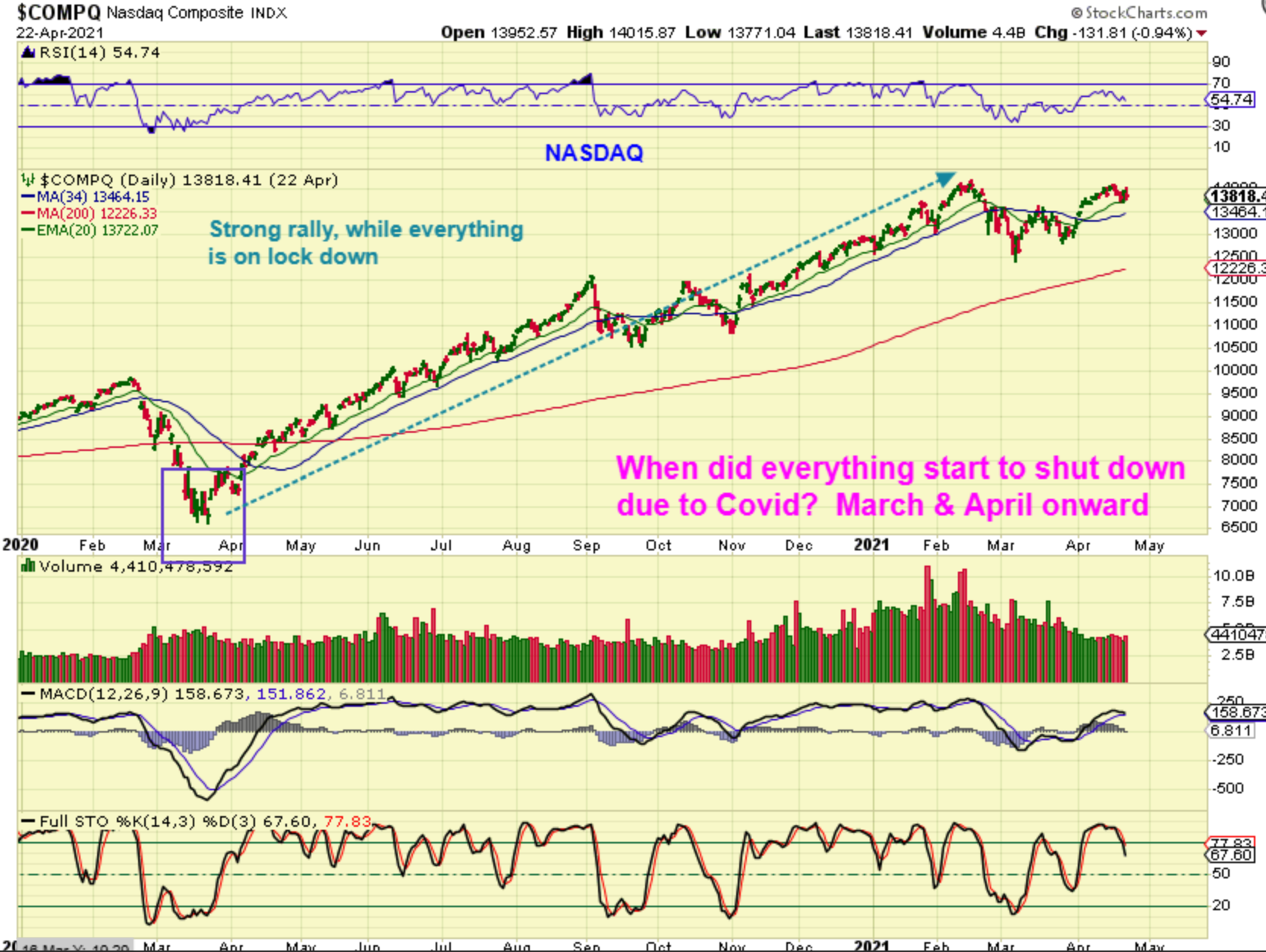 NASDAQ during the ‘COVID VIRUS CRISIS’ . I want you to remember what was happening in March 2020 through 2021. Businesses had to close down, people all went to lockdown. In the summer of 2020, we heard about refrigerator trucks holding hundreds of frozen bodies of victims in NYC with nowhere to go, tens of thousands were on respirators, the virus was extremely contagious, and it was global. With this uncertainty, there was no eating out, no more vacations, no more cruise ships, hotels and airlines would surely collapse, right? Spending was dropping fast, for people and companies. It doesn’t matter what you believed was happening, everything was shutting down and rumors of a complete collapse was spreading as fast as Covid,  BUT…..Look at the stock market.  It rallied ALL THROUGH that time period of the shutdown.