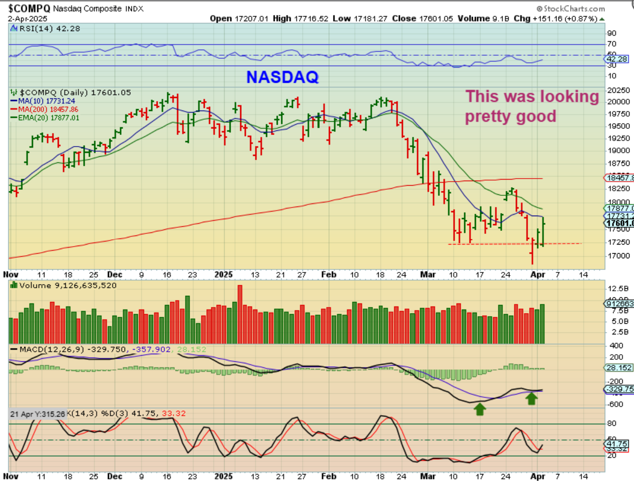 I must say, The NASDAQ was looking pretty good here, almost like we had an ICL in place and a recovery was going to develop. Volume was increasing, the MACD looked good, and I was thinking that maybe some shorts started to panic and cover. AFTER HRS, Trump started to speak and the markets actually rallied hard, but…