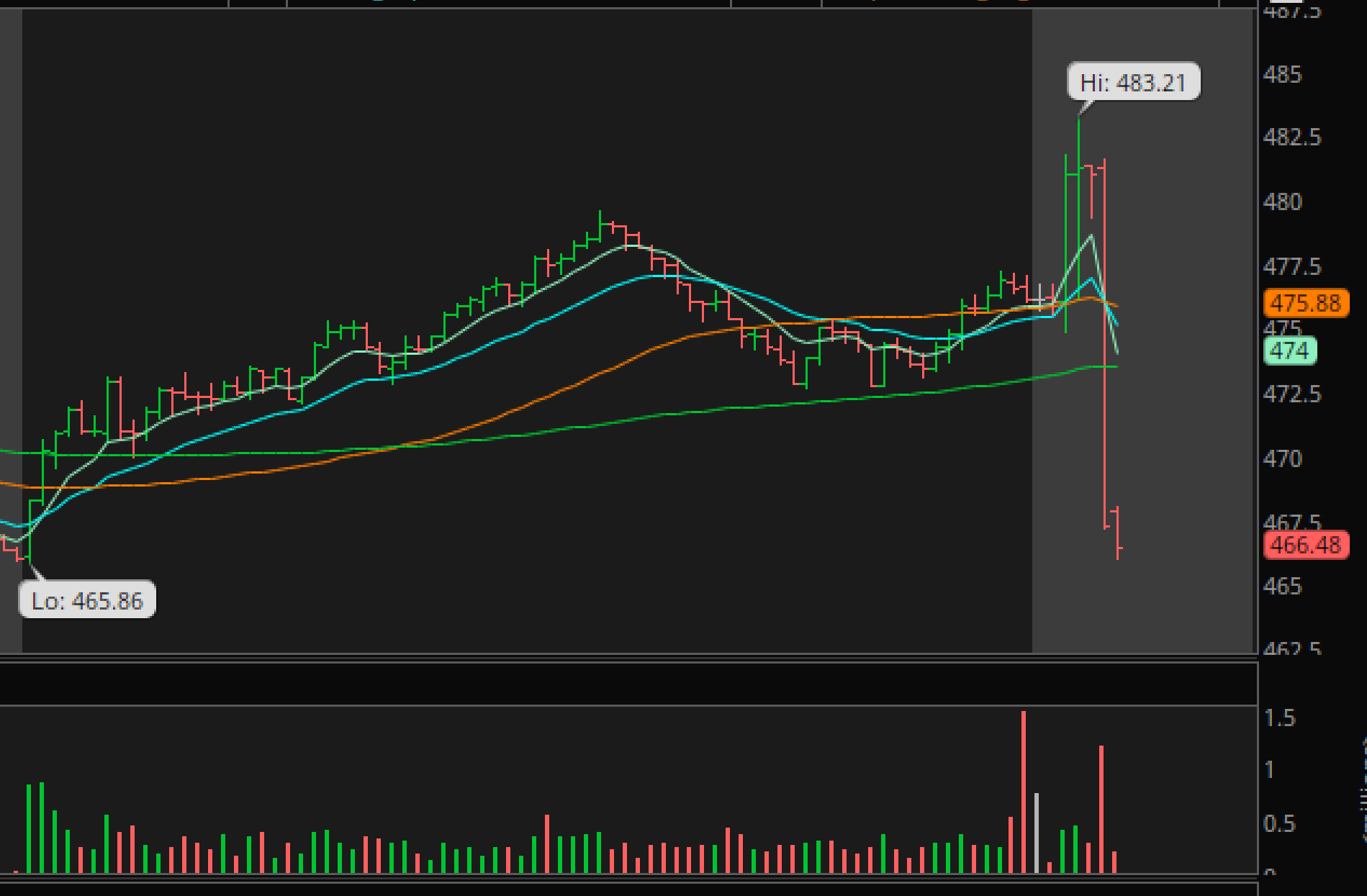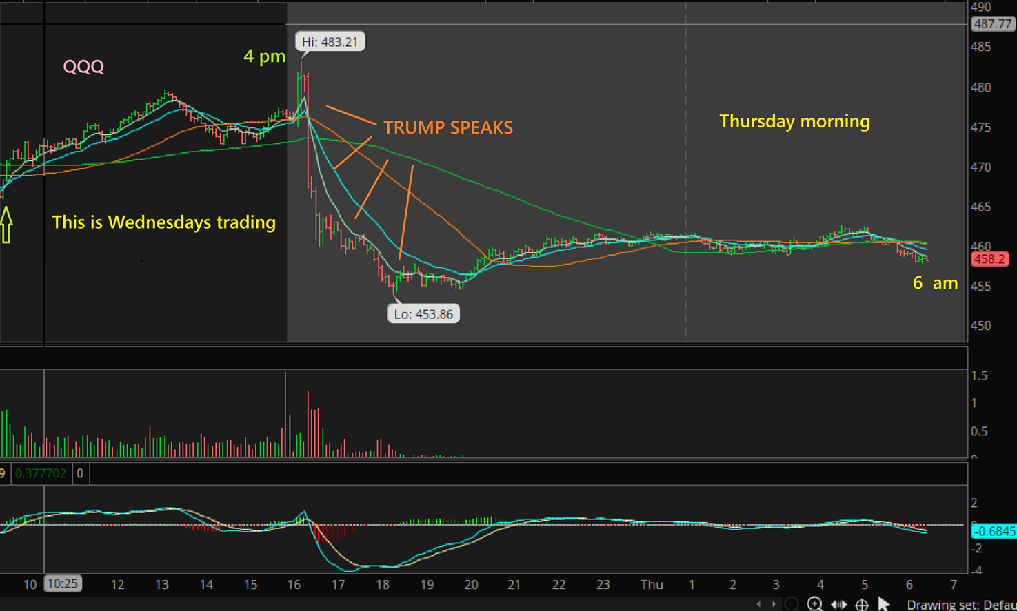 This is the QQQ as of 6 a.m. Thursday. That was quite the ‘Trump-Dump’. The shaded area is after hrs trading and you can see that the markets sold off and if they open here they’ll gap down open to new lows. We need to see if Jobless claims can help…or not.