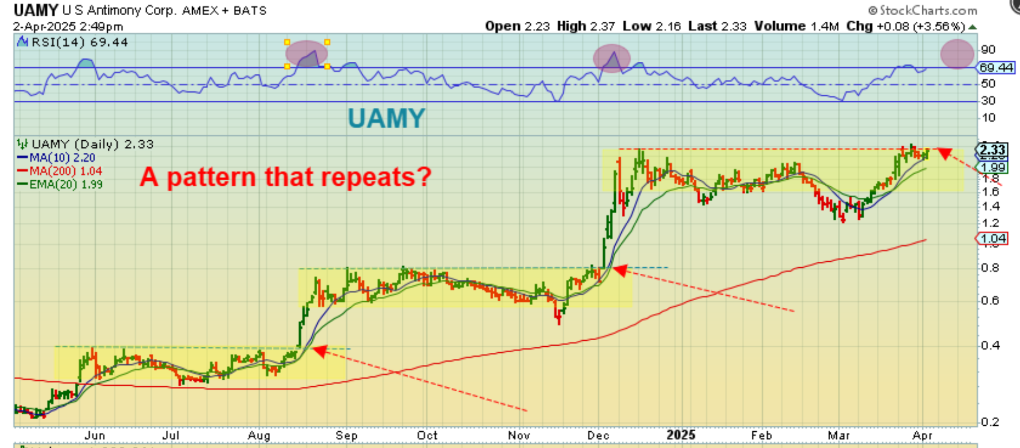 UAMY – Of course, I cannot guarantee that this is going to repeat, but I took a longer-term look of one of the Rare Earth stocks that I have been discussing, and I noticed a pattern of similar consolidations and then a breakout. It could pull back from here briefly and then breakout if the pattern repeats.