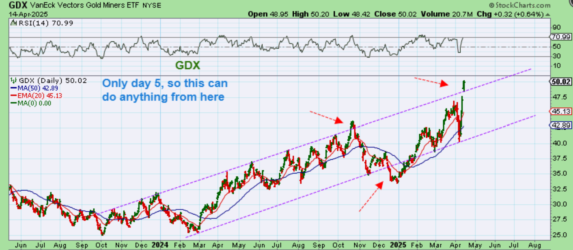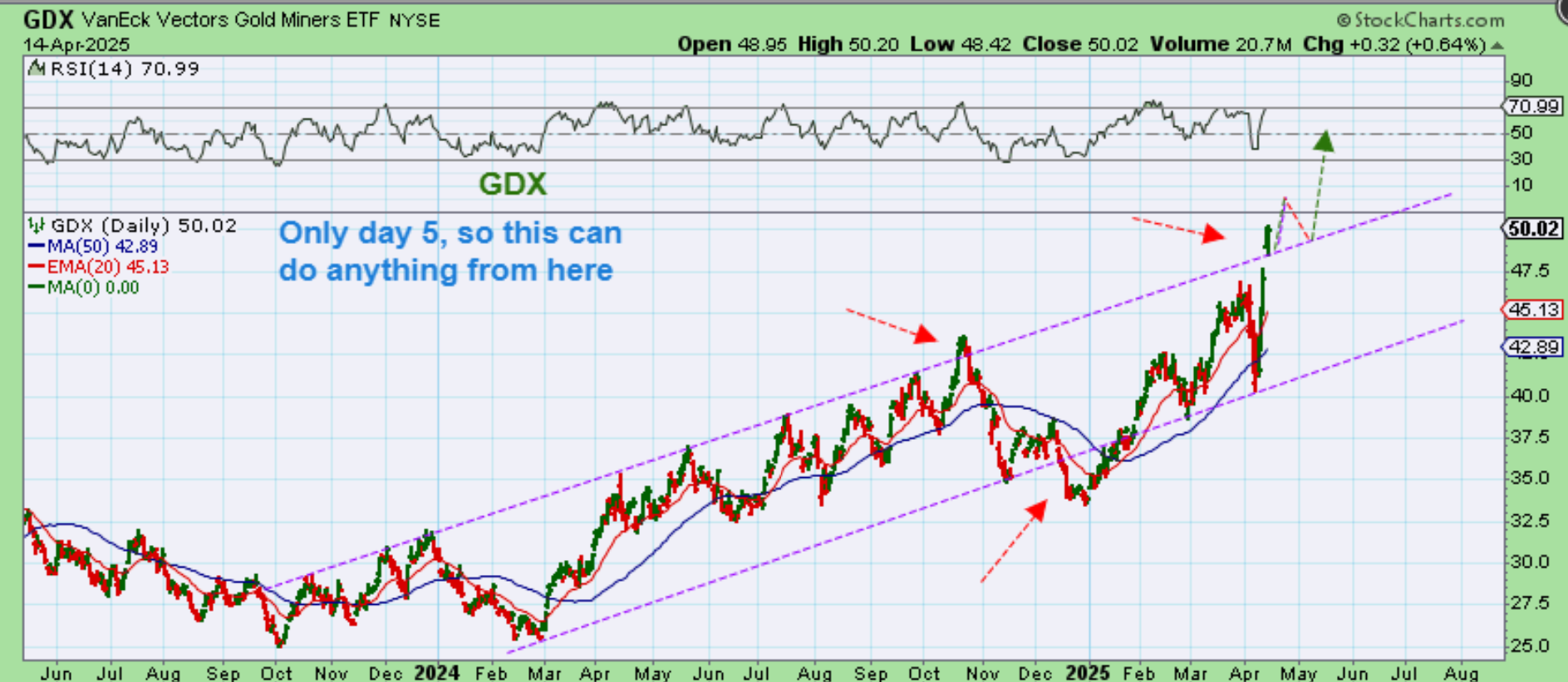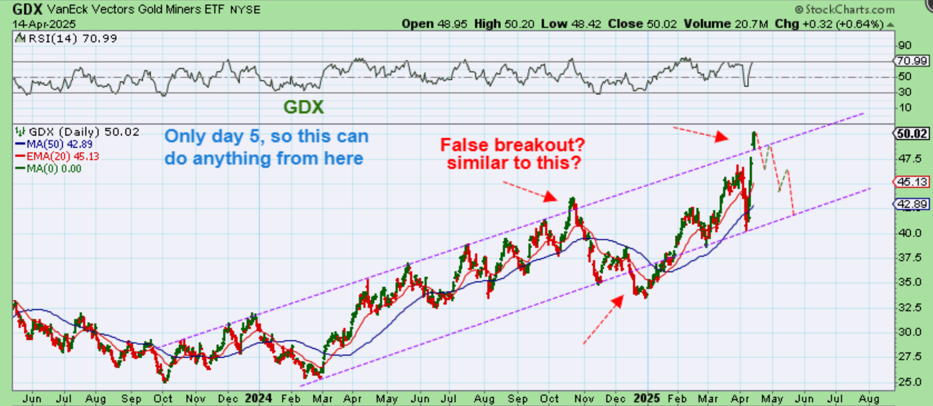 GDX actually broke out above that upper channel line. Often, we get a false break out from a channel and price dips back inside of it, but since it is only day 5, we could see more upside before this turns lower and re-enters the channel.