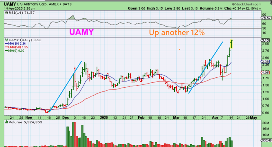 UAMY & REEMF: I had pointed these 2 rare earth mineral stocks out as bullish set ups despite the market crashing. I mentioned them as a buy & hold. UAMY was in the reports a few times. After reversing at the 50sma, UAMY gained over 80% from the $1.75 area. 50% above the $2 area.