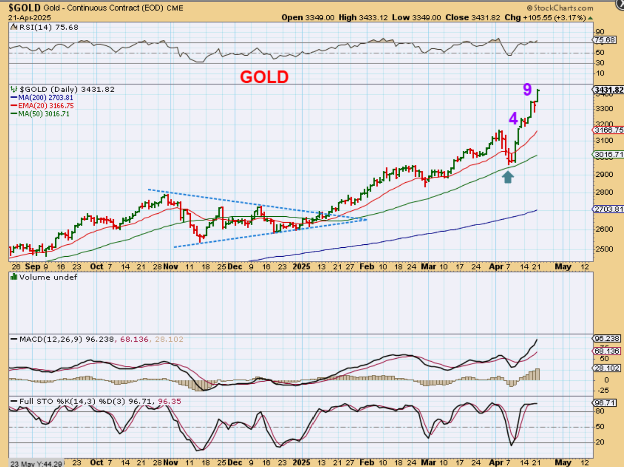 GOLD certainly did not slow down on day 9 Monday. Gold looks like it could go for the $3500 (nice round number) as the next point of interest. That $3500 is actually one of the targets on a weekly chart, but I wouldnt doubt Gold until we see a swing high in place.