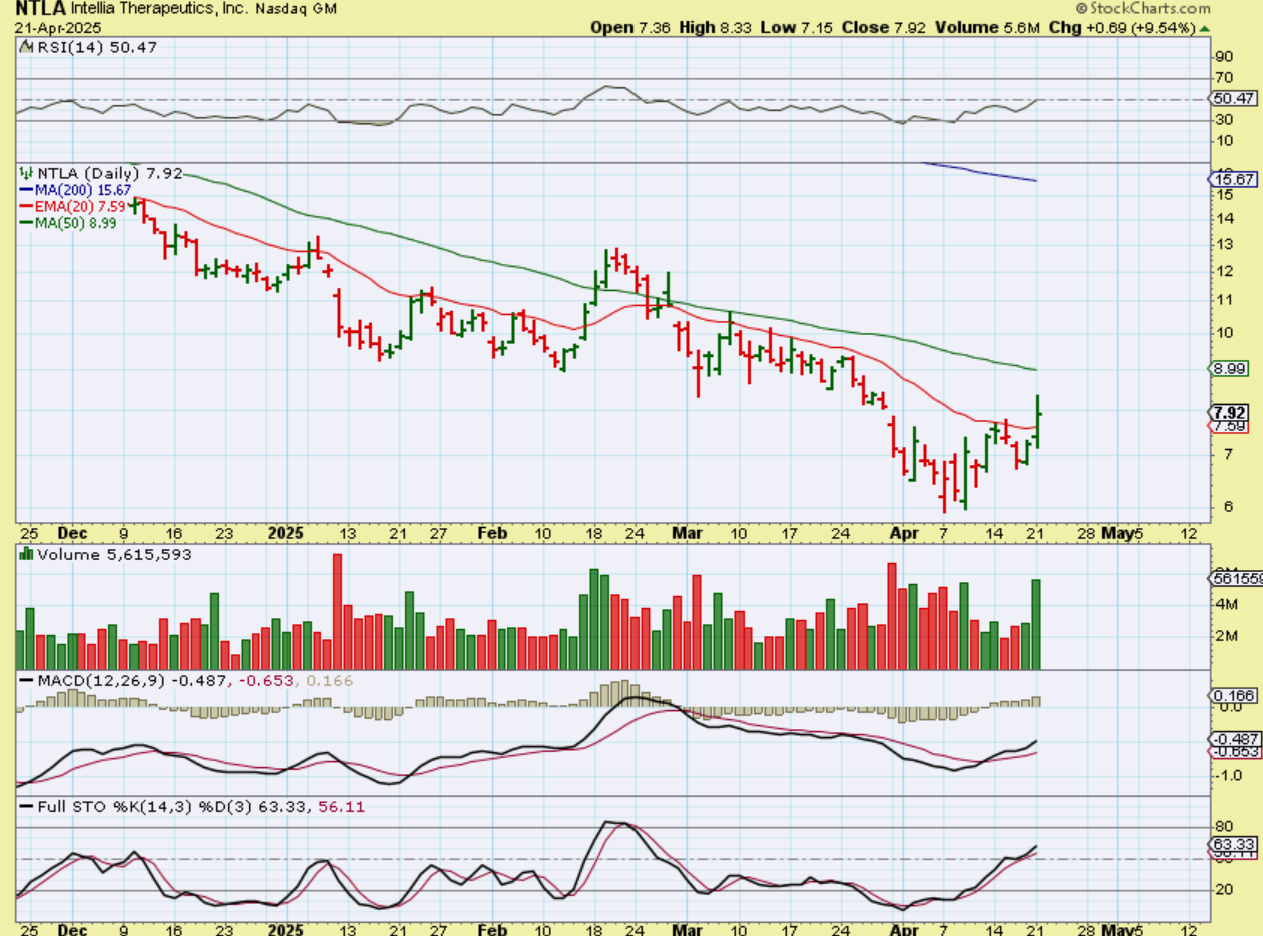 NTLA broke above the 20 ema and was up 10% yesterday at the close.