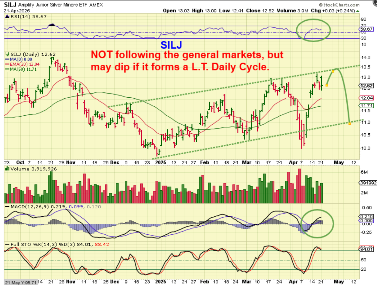 Silver stocks popped and gapped up nicely at the open, but as the day went on they sold down and closed the gaps when Silver started to sell off too. These are not ‘following the markets’ or they’d be much lower, but they can sell off at any time, with or without the general markets, because this could form as a L.T. daily cycle.
