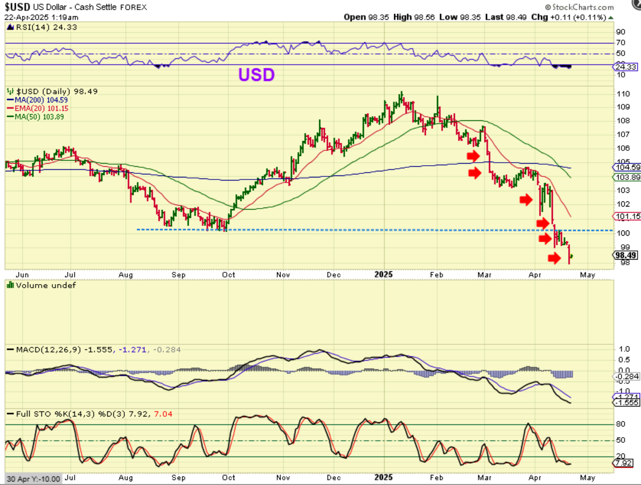 THE USD dropped sharply again yesterday, from above $99 to $98, making a new low and an even deeper breakdown from that long consolidation.