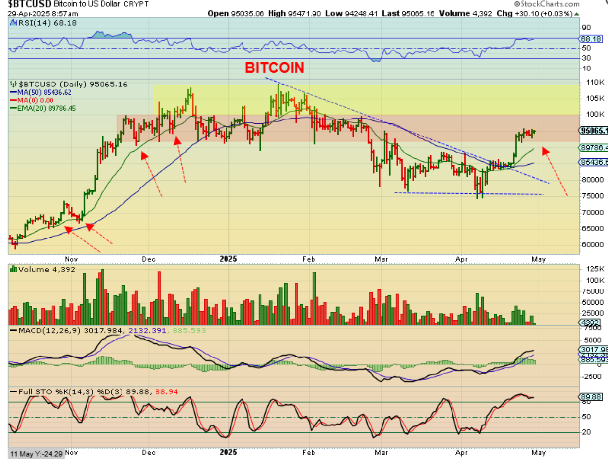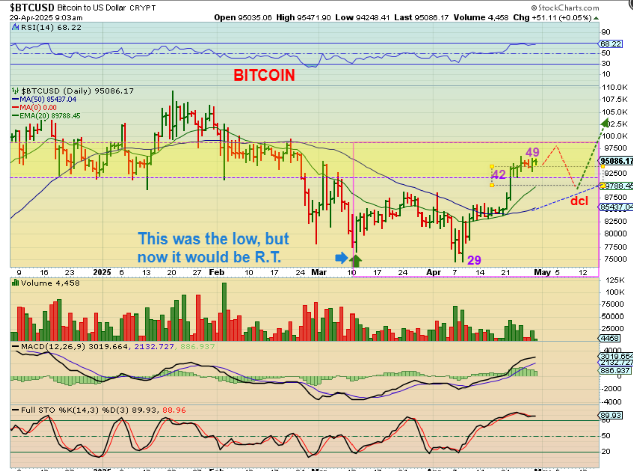 As I look at some Tech stocks, General Market stocks and now Bitcoin and even some crypto stocks, I am seeing charts that are changing from bearish ‘crash down’ charts on April 7th to more bullish looking charts, especially the weekly charts. I am going to write up something important for Bitcoin below, so please don’t miss it if that is a sector that interest you. Enjoy your Tuesday trading!