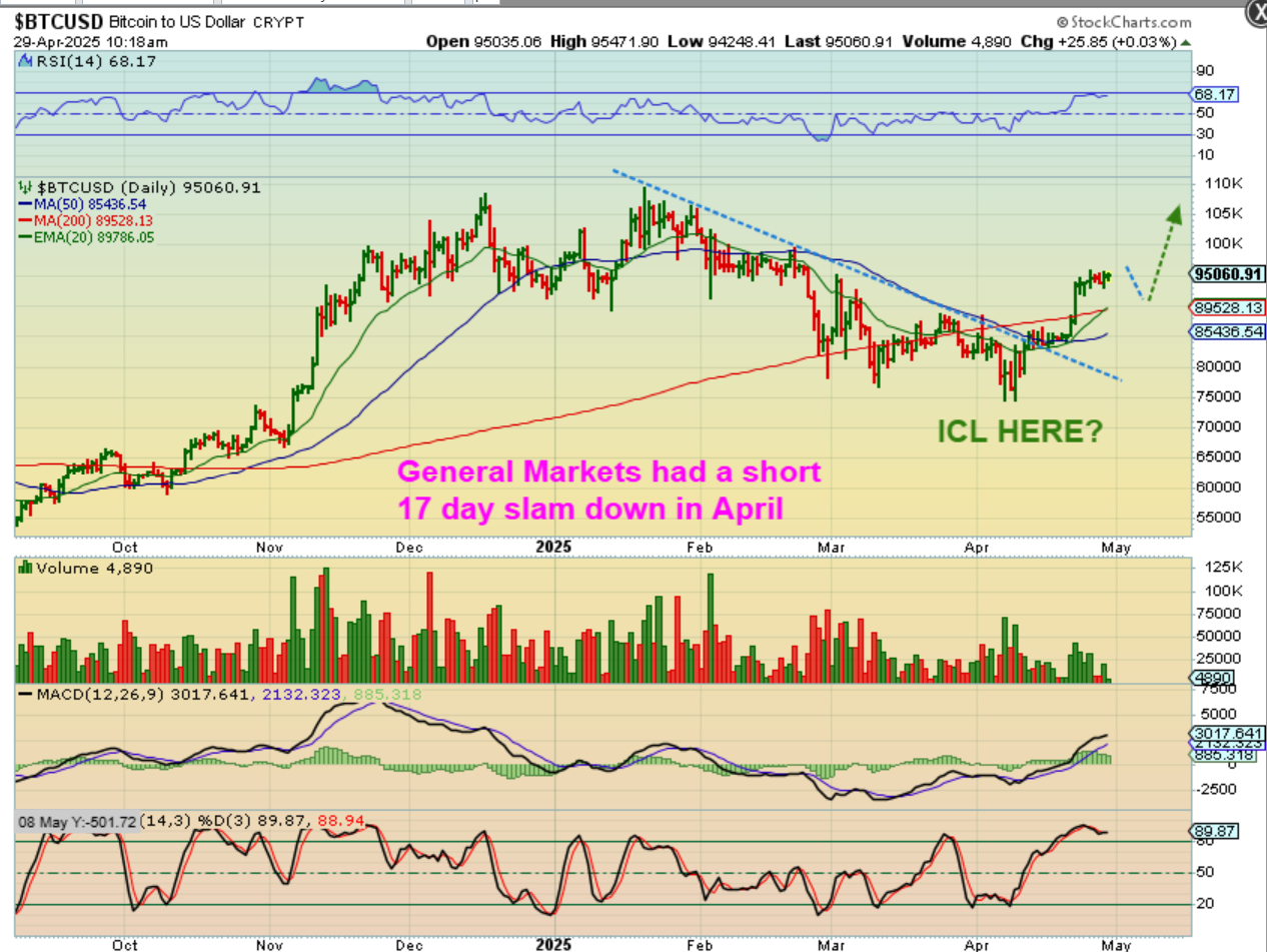 In other words, if we are saying that we had a shortened 17 day exhaustion slam down in April, and that became the ICL just like we saw in the Covid crash (an anomaly), then Bitcoin may actually have done a reset in April too. Look at April 7 on this chart with the new slam down low…