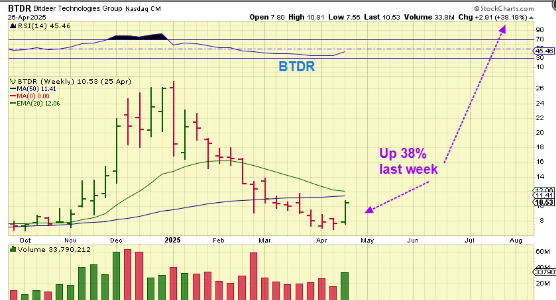 BTDR: I was running through some of the crypto stocks weekly charts this weekend, and you can see that some had a very big week moving out of the lows.