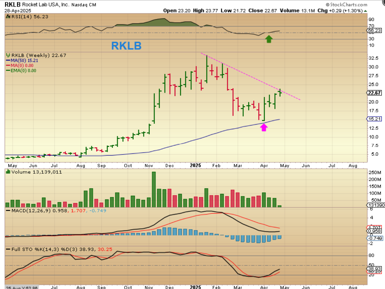 One of my former favorites is RKLB: It has reversed and moved from $15 to almost $24 already. With that, I would look at a daily chart and look to Buy the dip when we get a half cycle low or pull back to support.