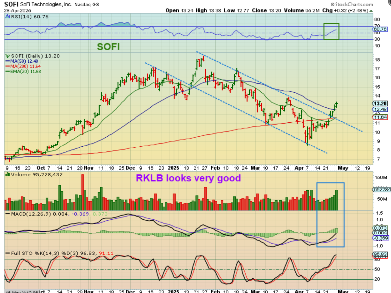SOFI – I have mentioned keeping an eye on or buying and raising stops on a few of the former bullish leaders (other than GOOG, AMZN, AAPL, etc) like RKLB, SOFI, RDW, TSLA, GRPN, UBER, etc. These are doing very well. SOFI has now regained the 50 & 200sma and volume has increased daily. $9 to $13 is a great trade, but over time a stock like this should make new highs if the markets remain bullish.