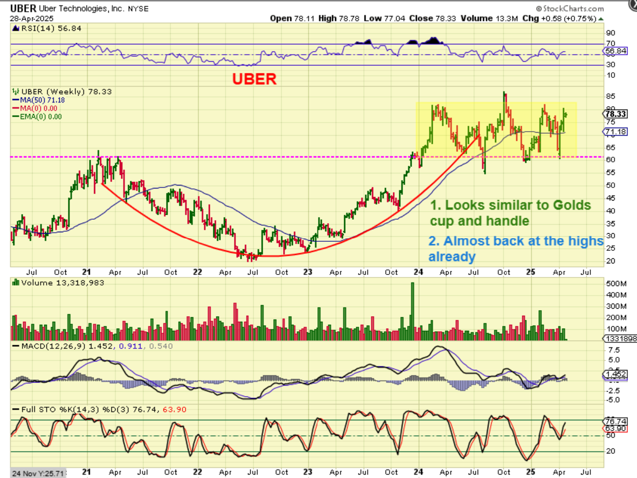 I want to share with you something that I have discussed and view as important during times of uncertainty, massive fluctuation, and ongoing change in the markets. When you are looking for clues about a chart / company that you may be looking to buy, flip it to a Weekly Chart. Take a look at UBER, for example. The general markets had that April 7 slam down low and after that, Uber ran back to the highs. Now it looks similar to Golds cup and handle before it broke out. Very Interesting.
