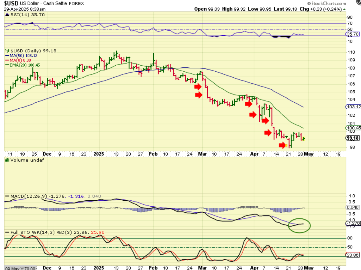 I wanted to point out the count again on Stockcharts for GOLD, because it is different than Spot Gold. Here it was day 14 on Monday and also looks like a possible half cycle low with available ‘time’ to possibly run again. GDX also still looks similar to Gold.