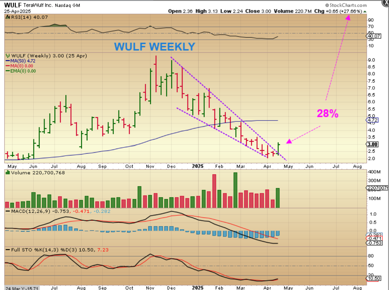 WULF: Wulf was also up almost 30% last week. They can pull back this week and then move higher again, or they can just continue higher, but it is noteworthy that they may have bottomed near the APRIL 7 low too.