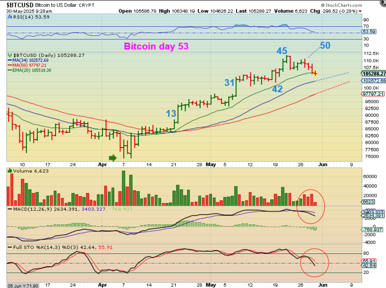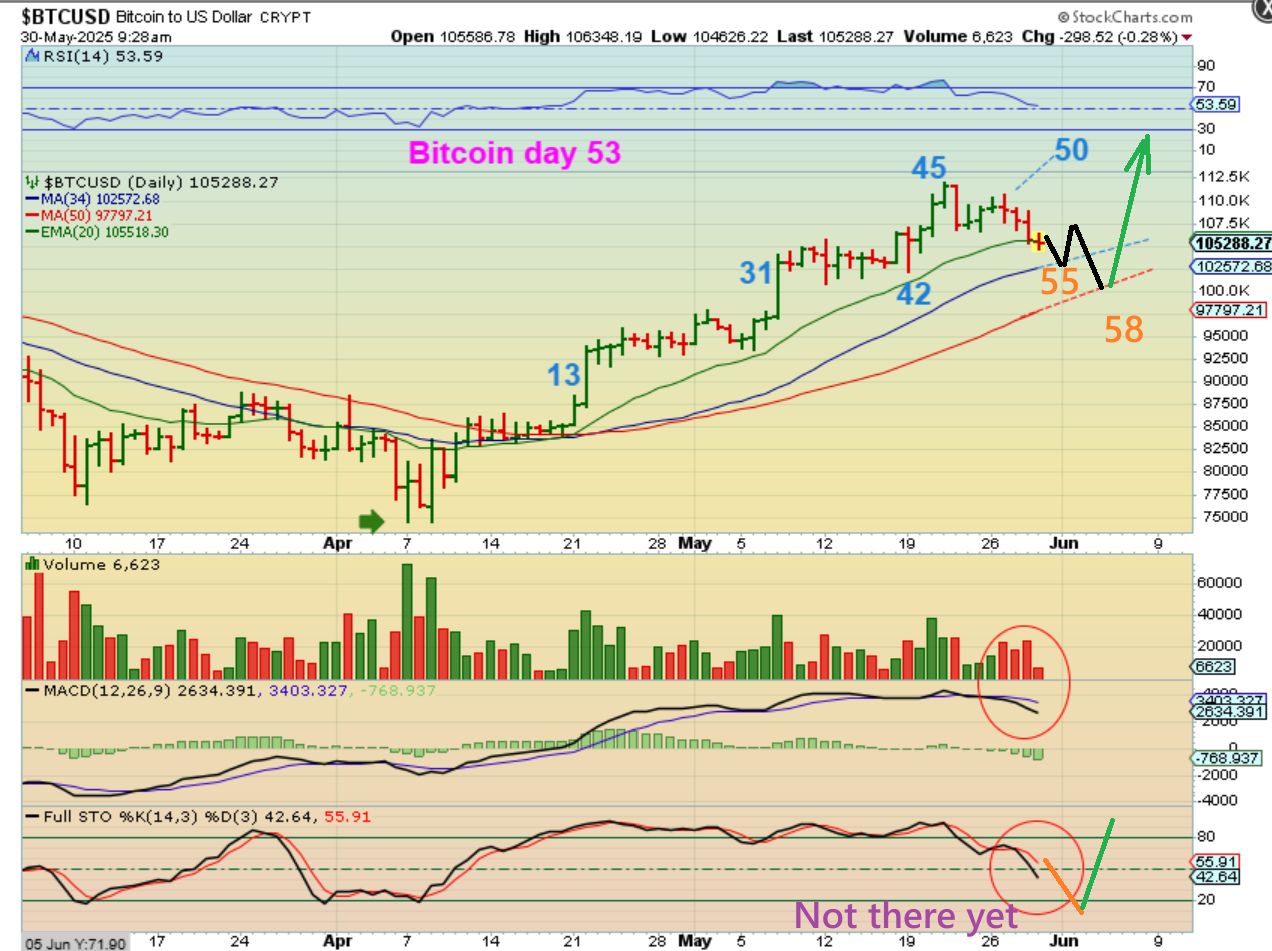 BITCOIN actually sold down that very day, so now we had a day 52 drop lower and this is Bitcoin day 53 live this morning. It now looks like the dip has started and to be honest, that low can form on day 56 or day 60, or day 62, so that means…
