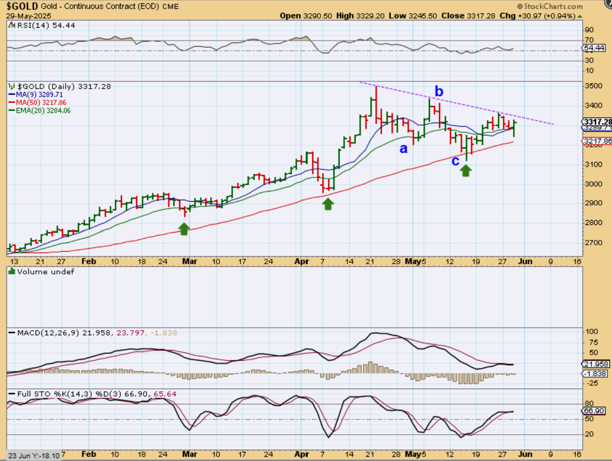 GOLD dropped and then reversed to green on Thursday, and it is close to that downtrend line. Silver and the Miners already broke above their downtrend lines, so it may just be a matter of time before Gold does too. This looks like a bullish set up with a possible a-b-c down into a triangle. Triangles can from dcls, but also an ICL. Also Silver looks to have an ICL, so the idea gains more likelihood with that set up …