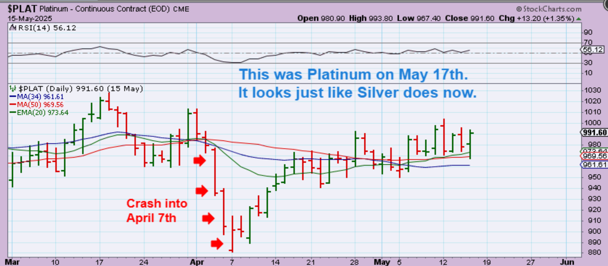 Just scroll up and down between the next 2 charts and you’ll see that they (Platinum & Silver) are very similar following that crash in April. The charts look like twins.