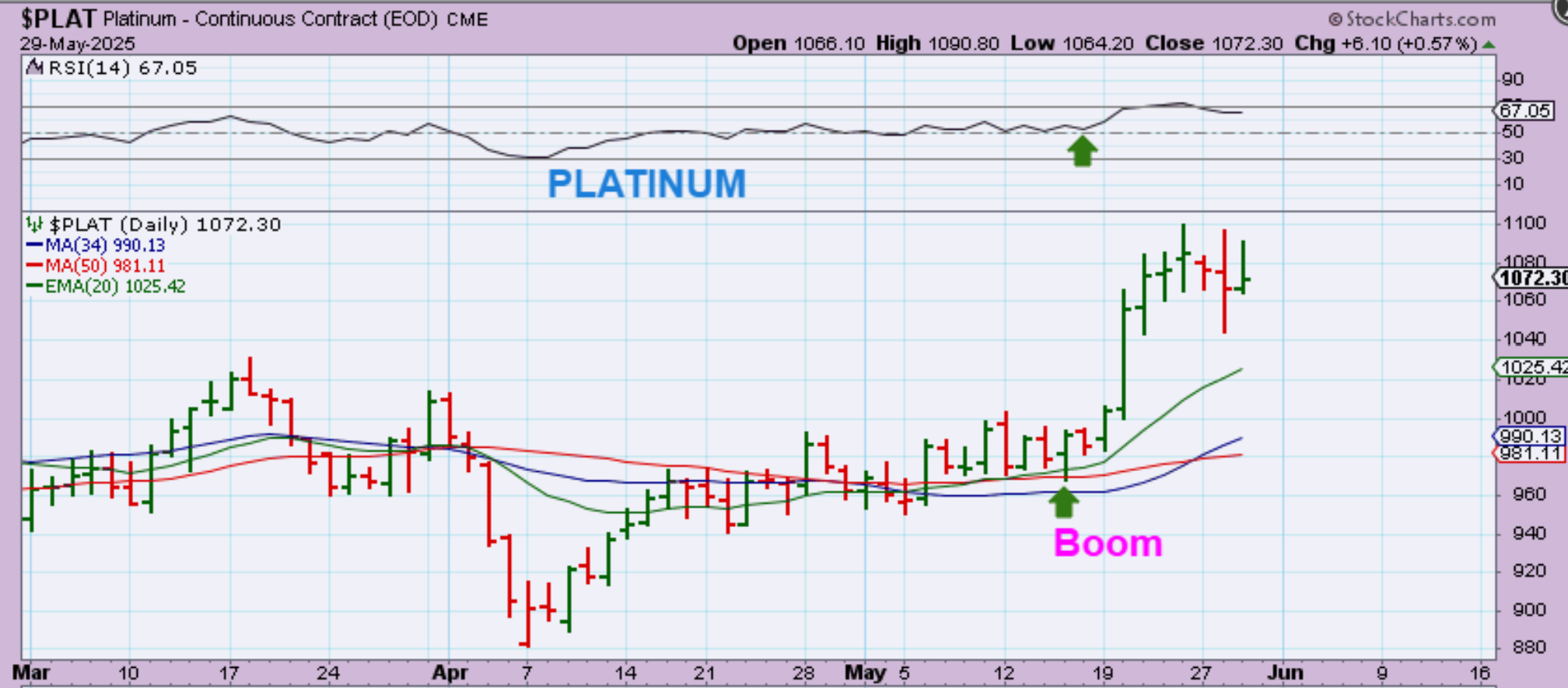 PLATINUM:  And this is what Platinum did when it broke from that pattern, so I want to point this out to prepare us for the possibility that Silver could Pop too. PLG and SBSW were rewarded when Platinum took off higher.