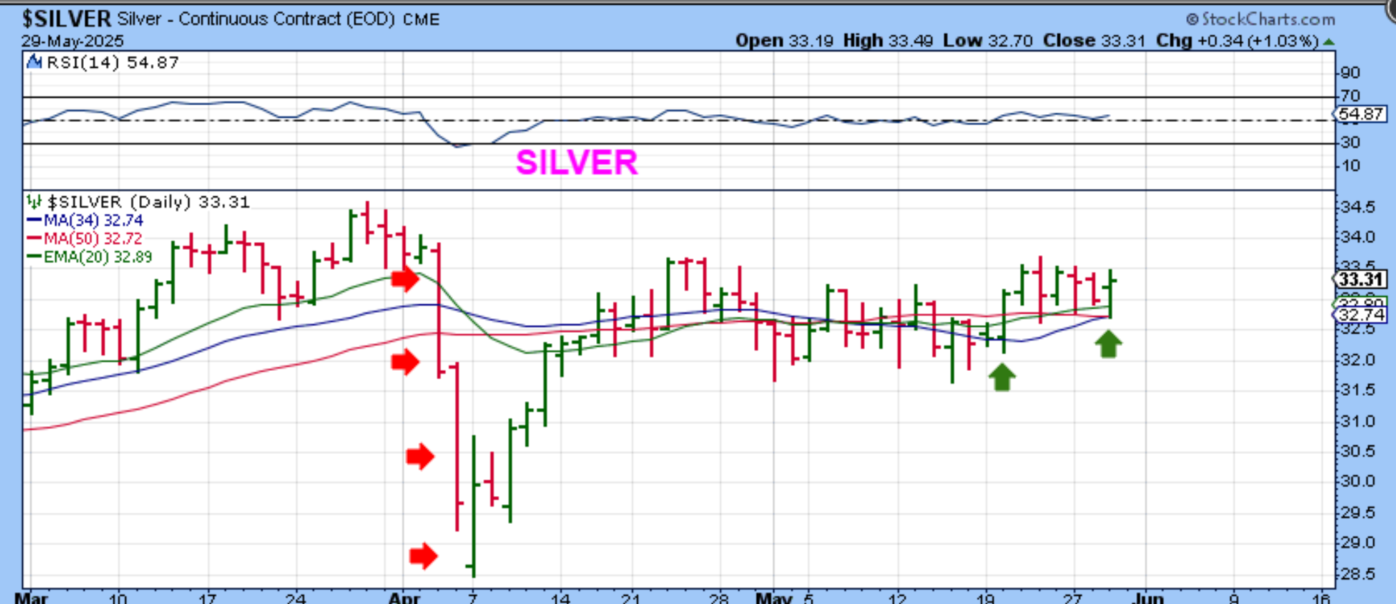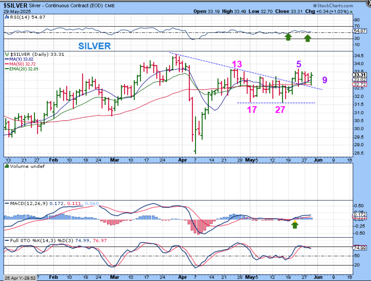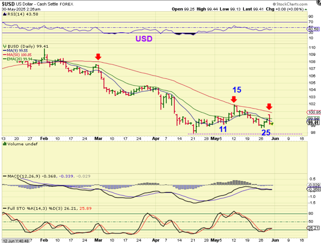 Same chart: If a dcl formed on day 25, it does indicate that an ICL formed with that sharp drop from March into April, because that day 25 low is a higher low. This obviously makes me wonder how Gold & Silver will act. It is possible that the USD does what Oil did, and that would be mostly chopping sideways in the first 2 daily cycles and then dropping as Gold runs higher.  We’ll see, because Gold and Silver are shaping up Bullishly too.