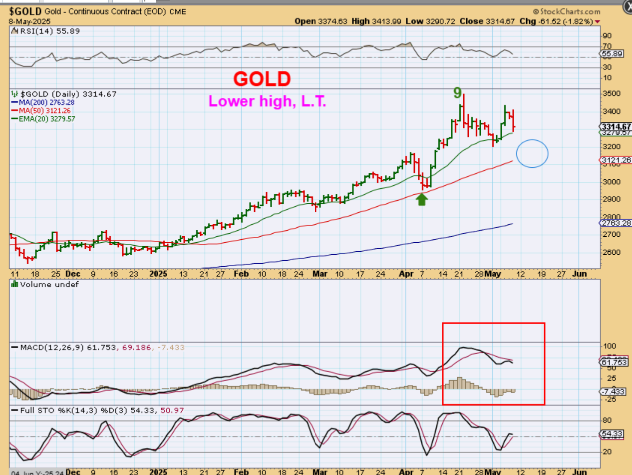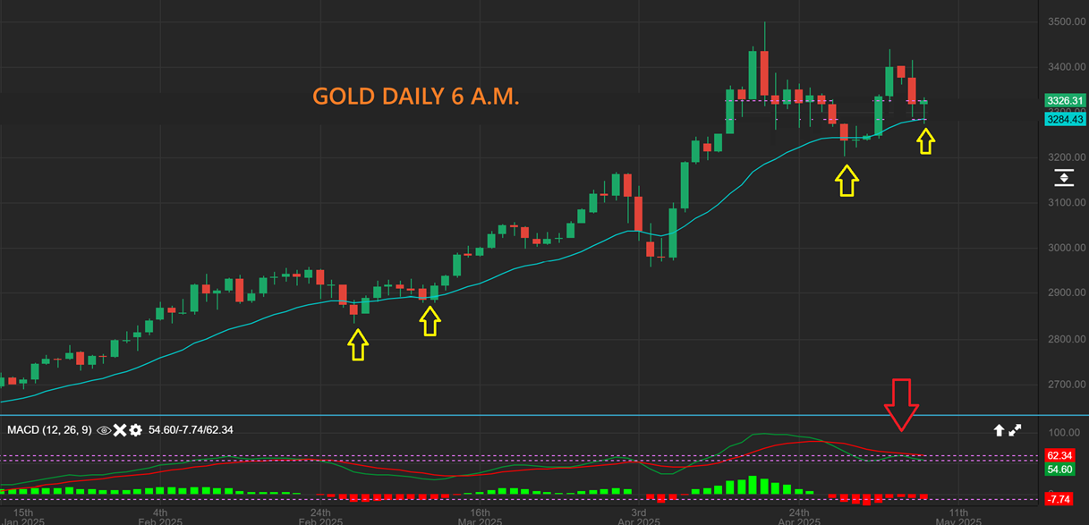 GOLD LIVE 6 am is trying to reverse this morning, but if I was heavily invested in Miners and I was Not trying to buy and hold from past ICLs, I’d use the bounce to lighten up. I think Gold has peaked for a little while.