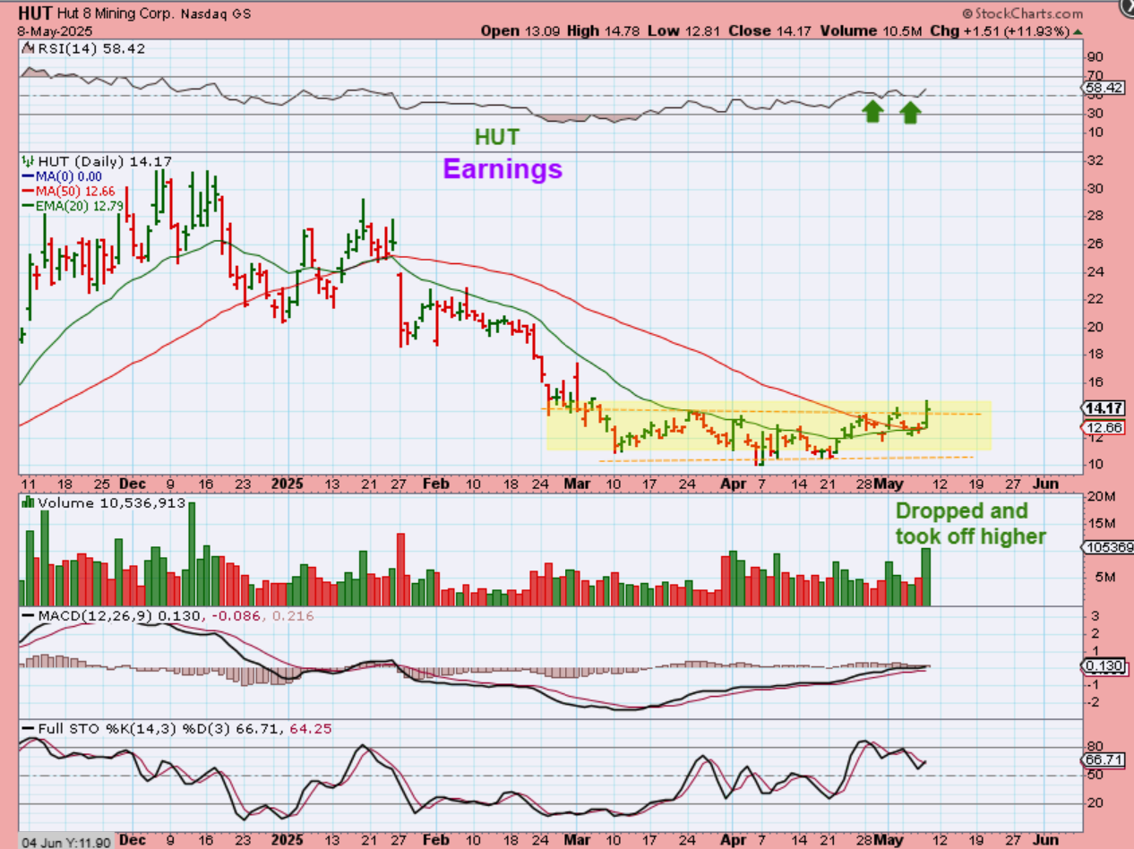 HUT released earnings and I saw it drop sharply pre-market. Then it started to bounce back with Bitcoin surging. You can see that it opened, dipped to the red 50sma, and then climbed steadily all day long. This is another base/ consolidation with PRICE ABOVE SUPPORT that played out nicely. If this can make its way back to the former highs, it is also a double.