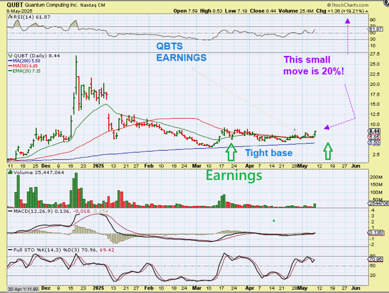 RGTI I then posted it rising back up, now up 8% (they move quite quickly). It closed up 11% and these are great looking bases / consolidations. Can it drop today? Yes, we keep seeing Pop & Drop, but one dy these could stairstep higher by a lot.  NOTE: EARNINGS IN 2 DAYS FOR RGTI, but…