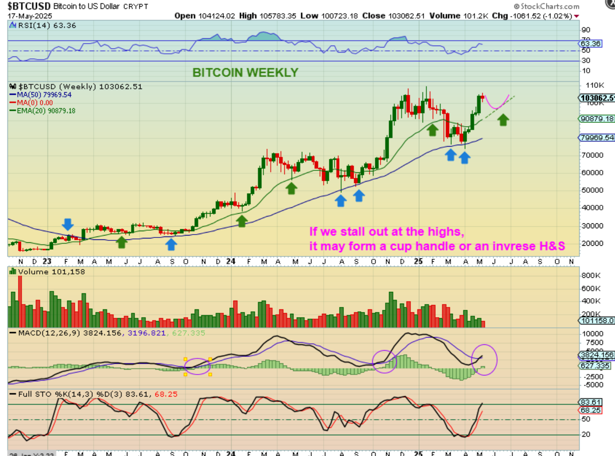 BITCOIN WEEKLY– So on the weekly chart, I claimed that this looked very bullish a couple of weeks ago and here we are back at the highs. Now if we break out, the run continues, and we do have time for that run to $120,000.  At the same time, we have time to put on a ‘handle’, so on this chart it would appear to be an Inverse H&S Pattern.