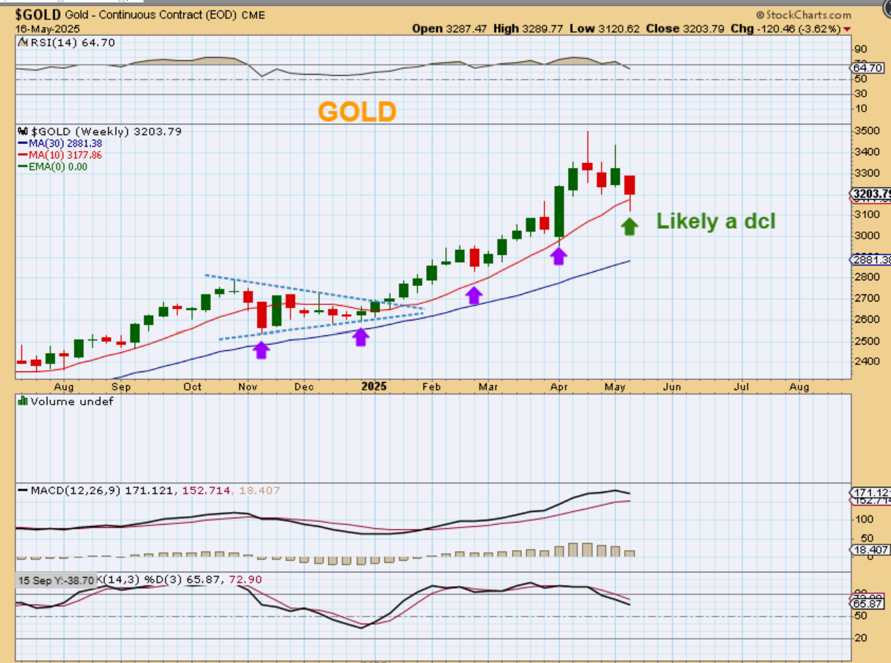 GOLD WEEKLY : So as mentioned above, Gold is in the timing for a dcl, and the weekly has a reversal candle right at the 10 week ma. This is likely the next daily cycle low.