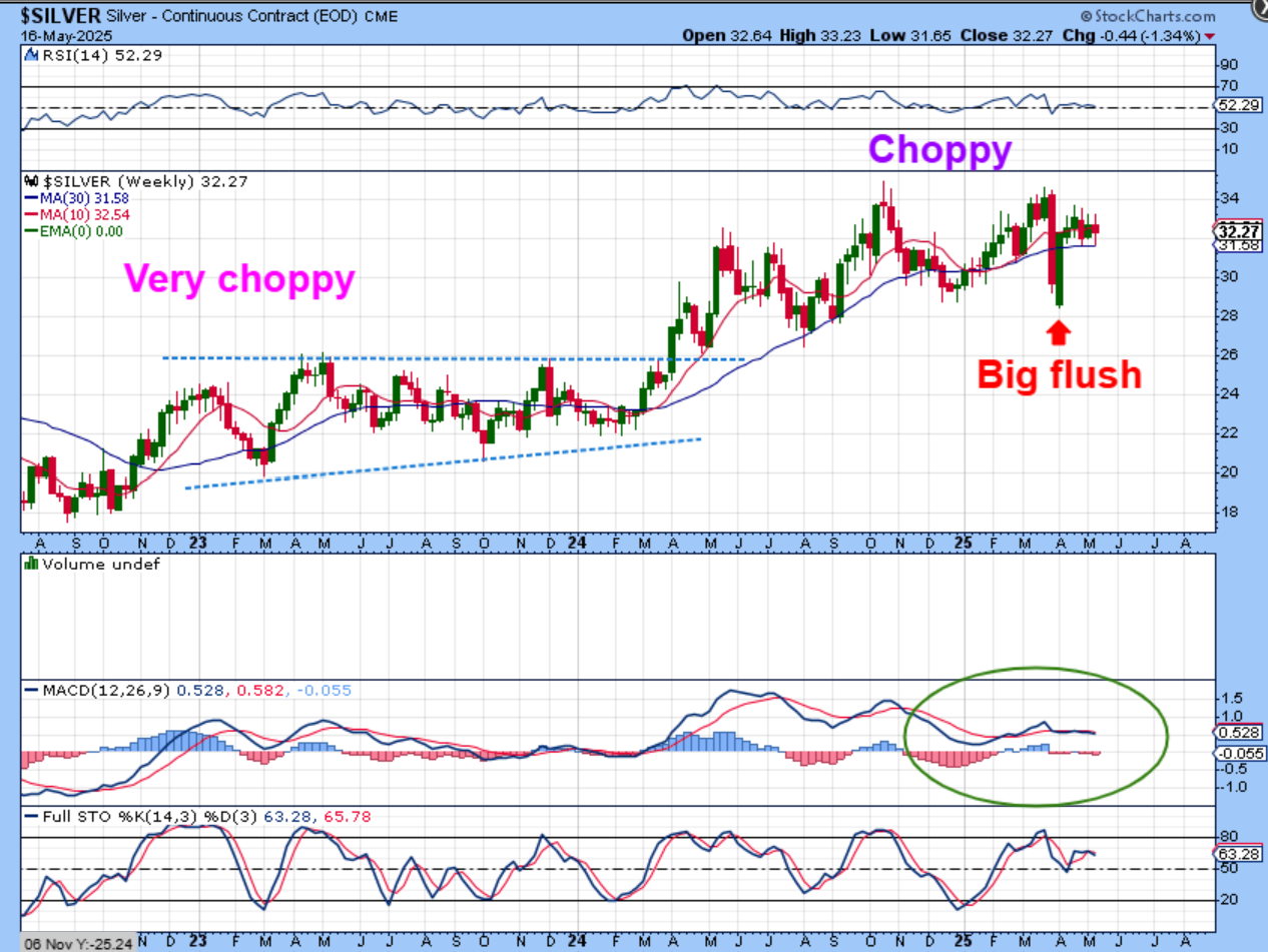 SILVER WEEKLY– Silver is so choppy that the chart is really just a mess. Was that a ‘flush out’ ICL on April 7, arriving at the same time that the General Markets put in an early ICL? It may be, but right now we still have more choppiness and need more time to see if it runs up to make a new high. So far Silver is holding up at the blue 30 week ma.
