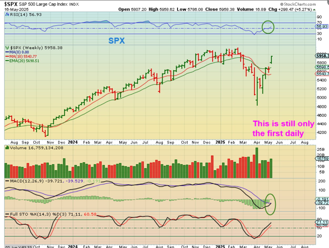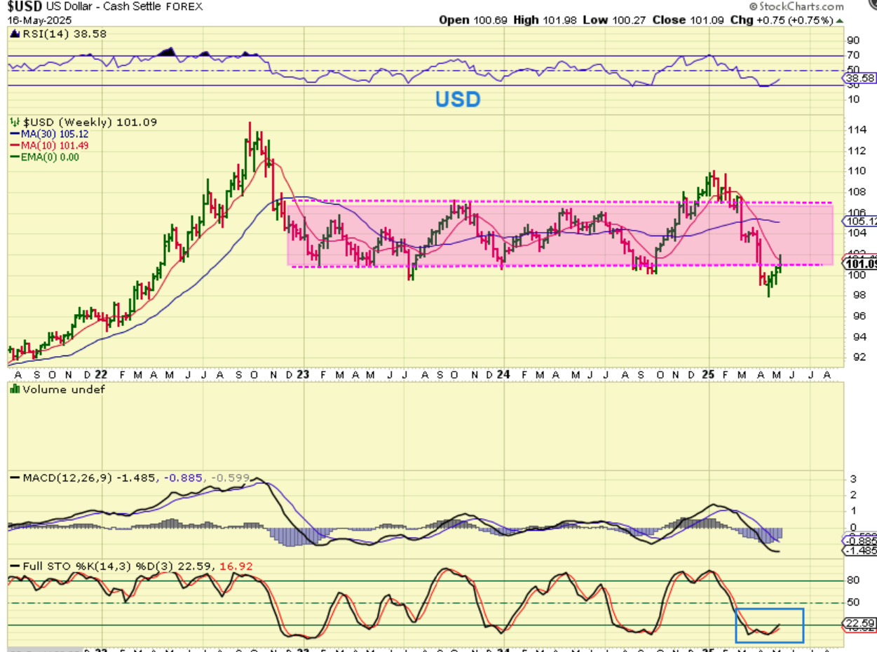 That is our review of the current set ups and as you can see, that crash down with the ‘tariffs’, inflation threats, recession chatter, and so on was an exhaustion crash. Now the slam down has recovered with a V-Bottom and is almost back at the all-time highs. The USD is rising up out of a low and the Precious Metals sector has pulled back a bit, but it is due for a dcl. The bounce should form L.T. and roll over 1 more time for an ICL, but bull markets can have surprises to the upside, so stay frosty, my friends!