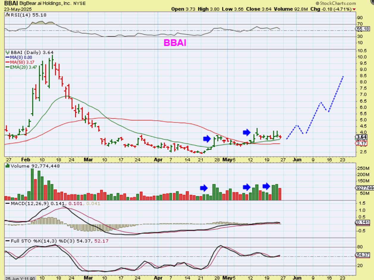 Another example is BBAI – This stock is not really ‘dropping lower’ like the SPX & NASDAQ. It is at support and has some nice volume pops with it.