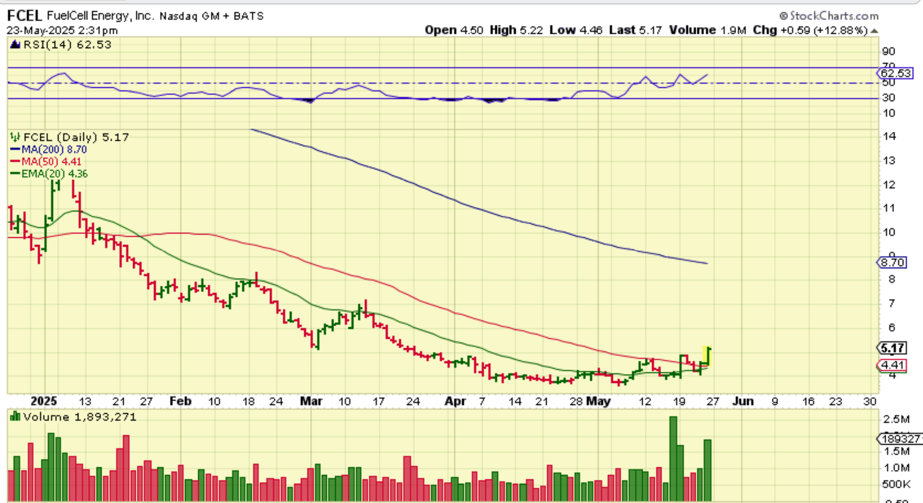 FCEL is even better, since it is popping higher above the 50sma with volume, ignoring any selling in the general markets.