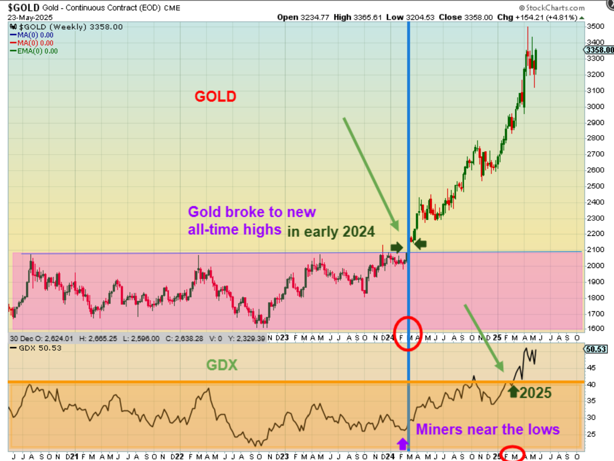 I also remembered this point. Do you remember that Gold broke out to new all-time highs in early 2024, yet the Miners were still near their lows? Doesn’t that sound familiar with Bitcoin and Crypto stocks. But then we made great gains when Miners started to play catch up, and that may be exactly what is happening with Crypto right now.