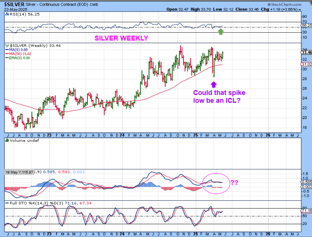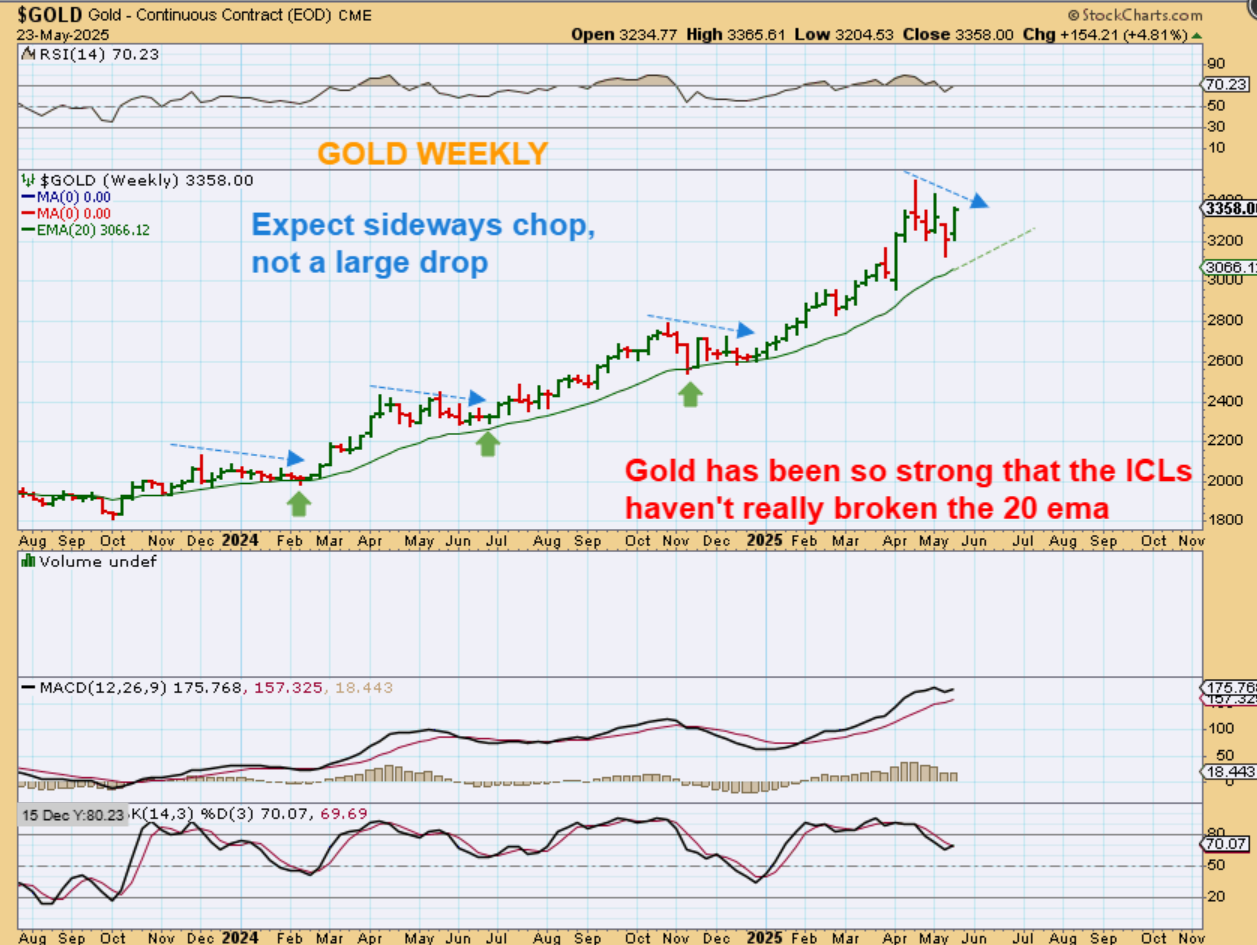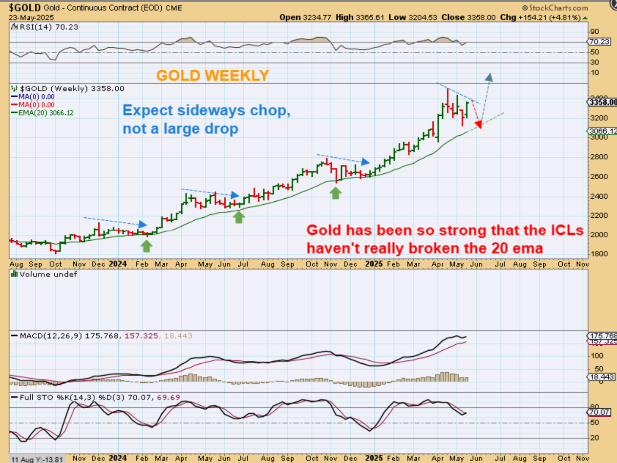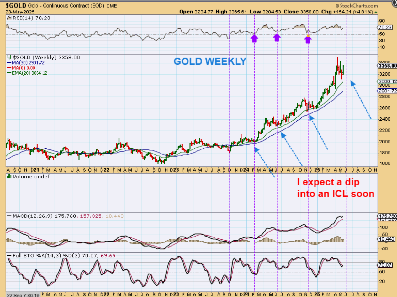 GOLD put in a reversal candle 2 weeks ago and had solid follow through last week. This has the appearance that it wants to just run higher again, but the cycles do not show a normal ICL, so I look back at past ICLs. Those blue arrows show a choppy, somewhat mild dip into the past ICLs. Those ICLs came very close to or tagged the green weekly 20 ema. It is possible to mimic that now with another dip.