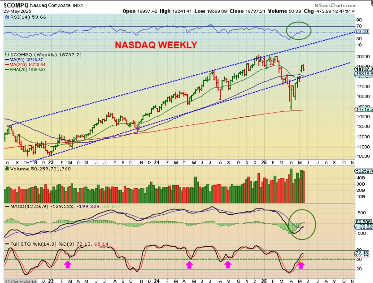 THE NASDAQ WEEKLY dropped last week and is also above support. A drop lower to support is not a deep drop at this point and we seem to have recovered this upward sloping channel. If you take a look at NFLX and TSLA – they are hardly dropping at all. They have moved sideways.