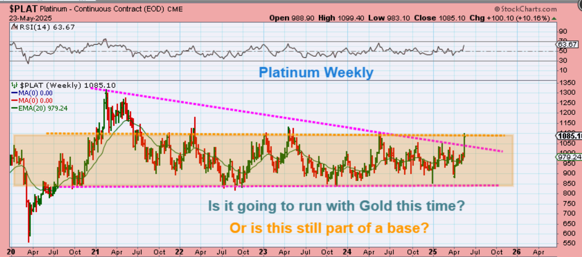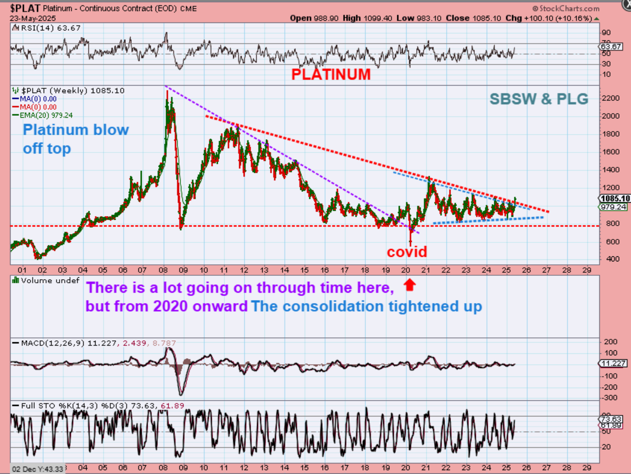 We see that Platinum popped 10% and started to break out. I mentioned before that when I used to trade in 2000 to 2008, Platinum was ahead of Gold, it would lead Gold higher. Now gold is at all-time highs and Platinum just chopped around for years. Ever since the 2000 COVID CRASH, Platinum tightened up and formed a choppy wedge. It may be ready to breakout here and run. Let’s zoom in…