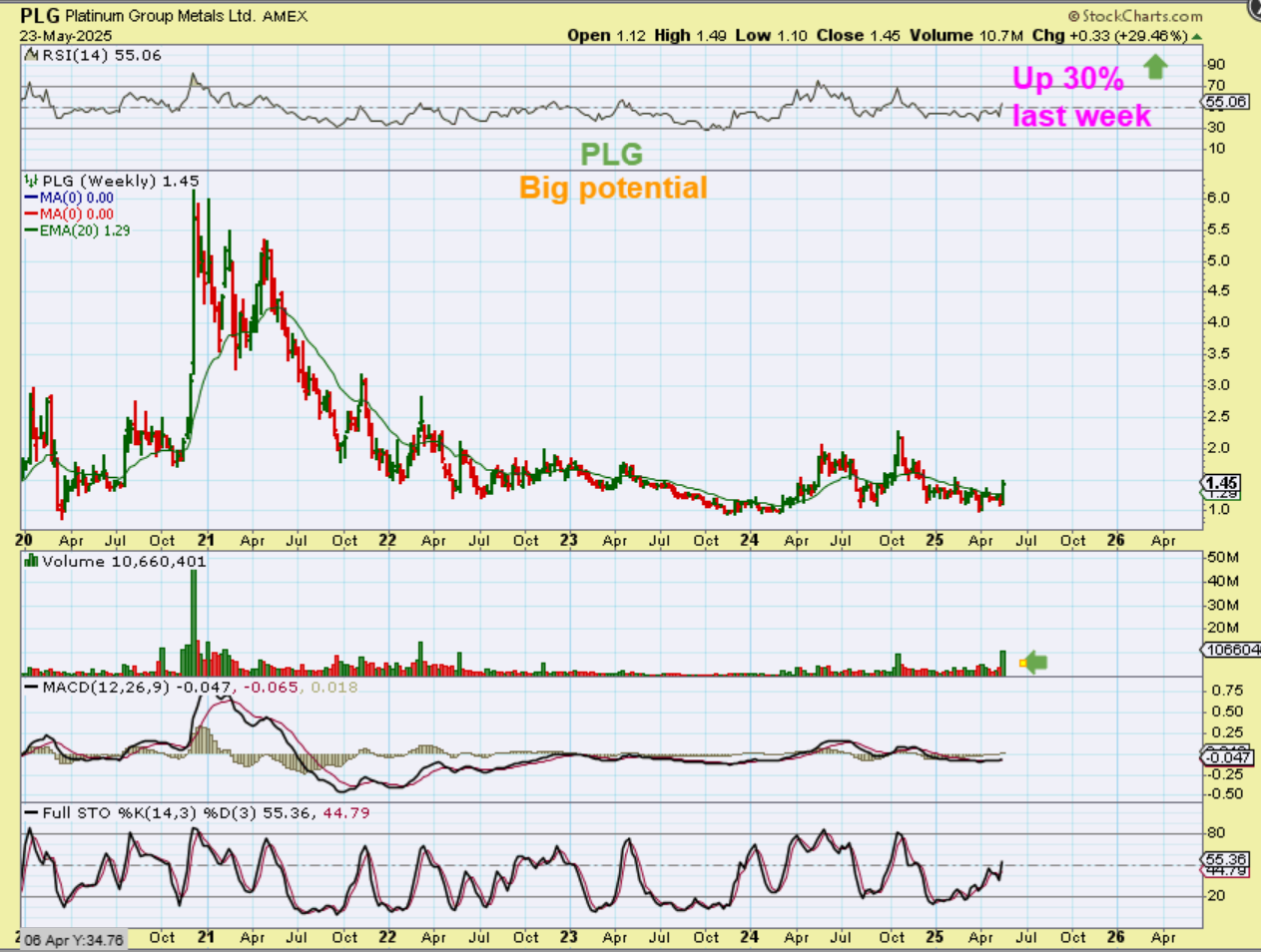 PLG was pointed out during the weekday reports and it ended up ‘up 30%’ for the week. The upside potential looks very good is Platinum runs. Also…