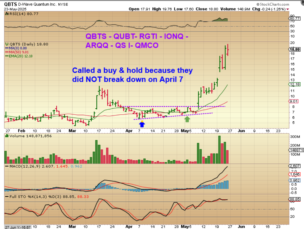 And of course we have the QUANTUM STOCKS: They are flying in the face of the sell off. These were pointed out as ‘Buy & Hold’ in a base, because they actually stopped selling off when the markets crashed deeply into an April low. These made higher lows and formed bases.