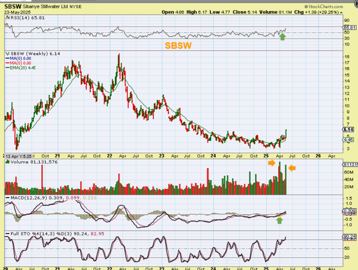 SBSW was also up 30% and this is obviously breaking away from a base. Volume is spiking and you know that I like to see that at the lows. From roughly $3 in April to possibly back to the highs over time, this would be a very profitable run too, if Platinum is on it’s way. There are not many Platinum stocks, so many buyers would likely be piling into PLG & SBSW.
