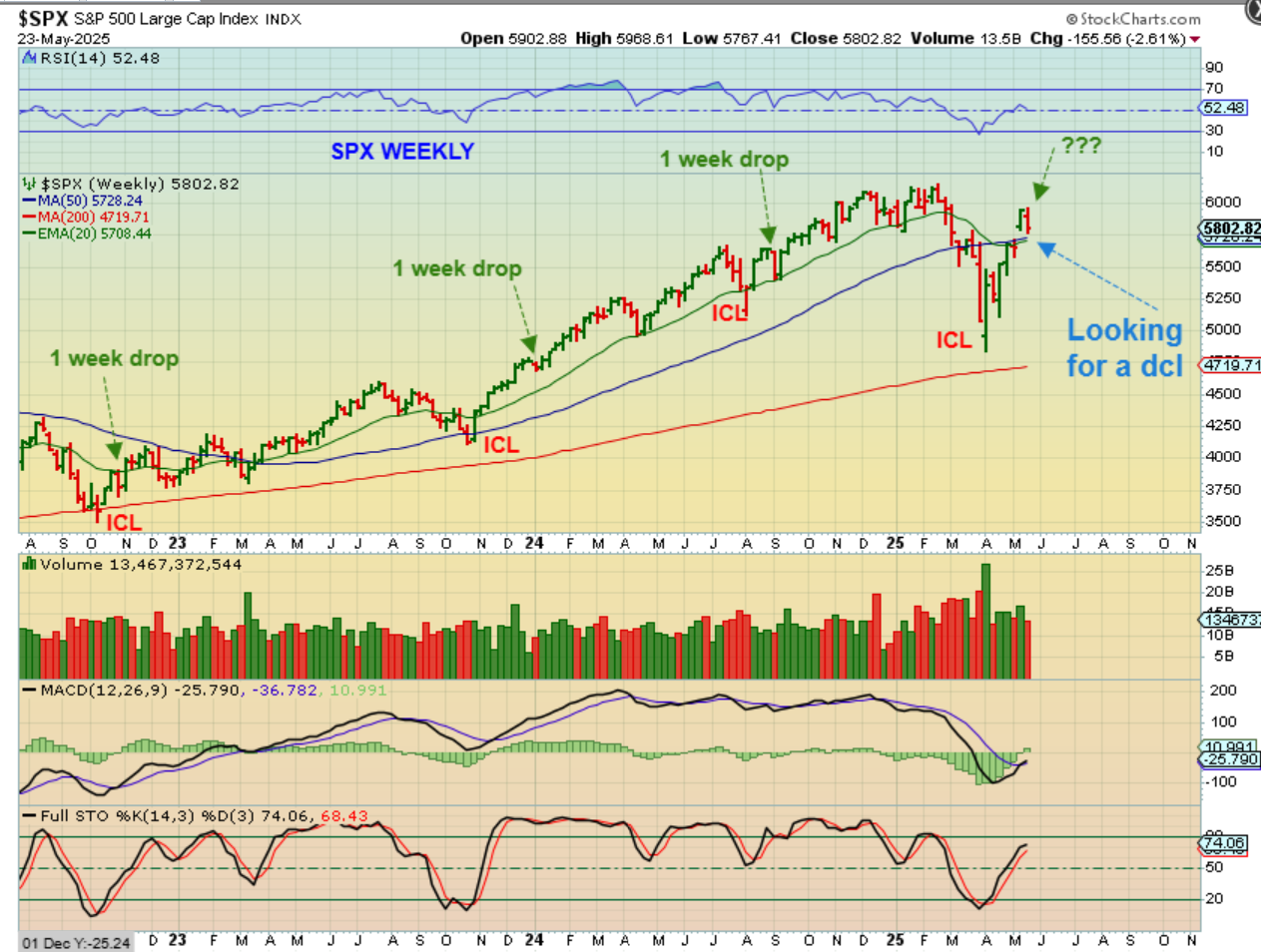 SPX DCL? – We are within the timing for a dcl, and right now we have a mild 4 day dip lower to the 20 ema. That 20 ema was resistance in March, so it may act as support now, but we won’t know for sure if the dcl forms here until we get a good bounce. I will point out something that seems important to me though…